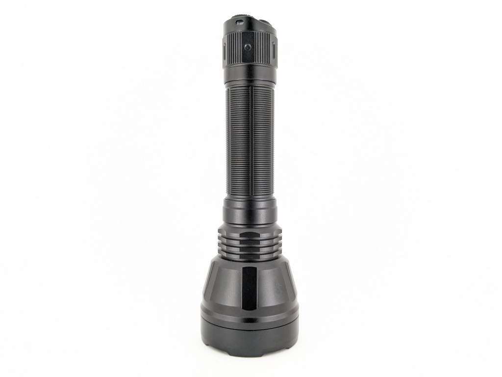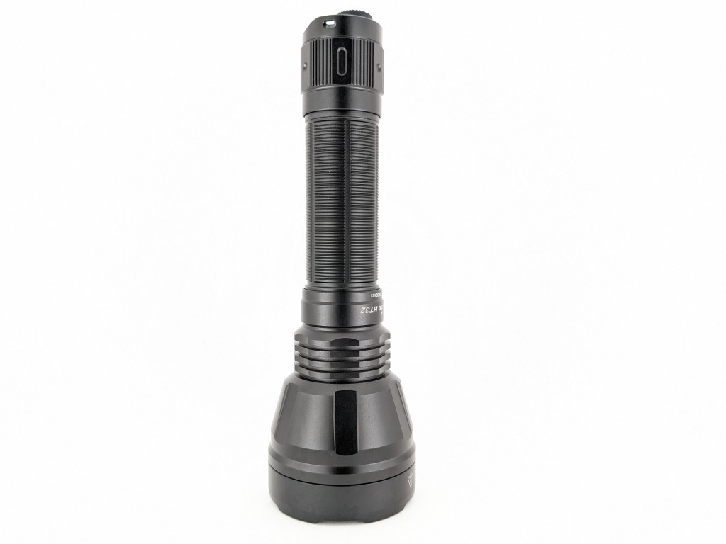 HD32 is a traditional flashlight shape with a switch on the tail, a narrow body tube, and a flared-out head. There’s tasteful machining all over the light to add grip, cooling, and style. I think it looks great. The only thing I’d change is to add some anti-roll flats on the head.