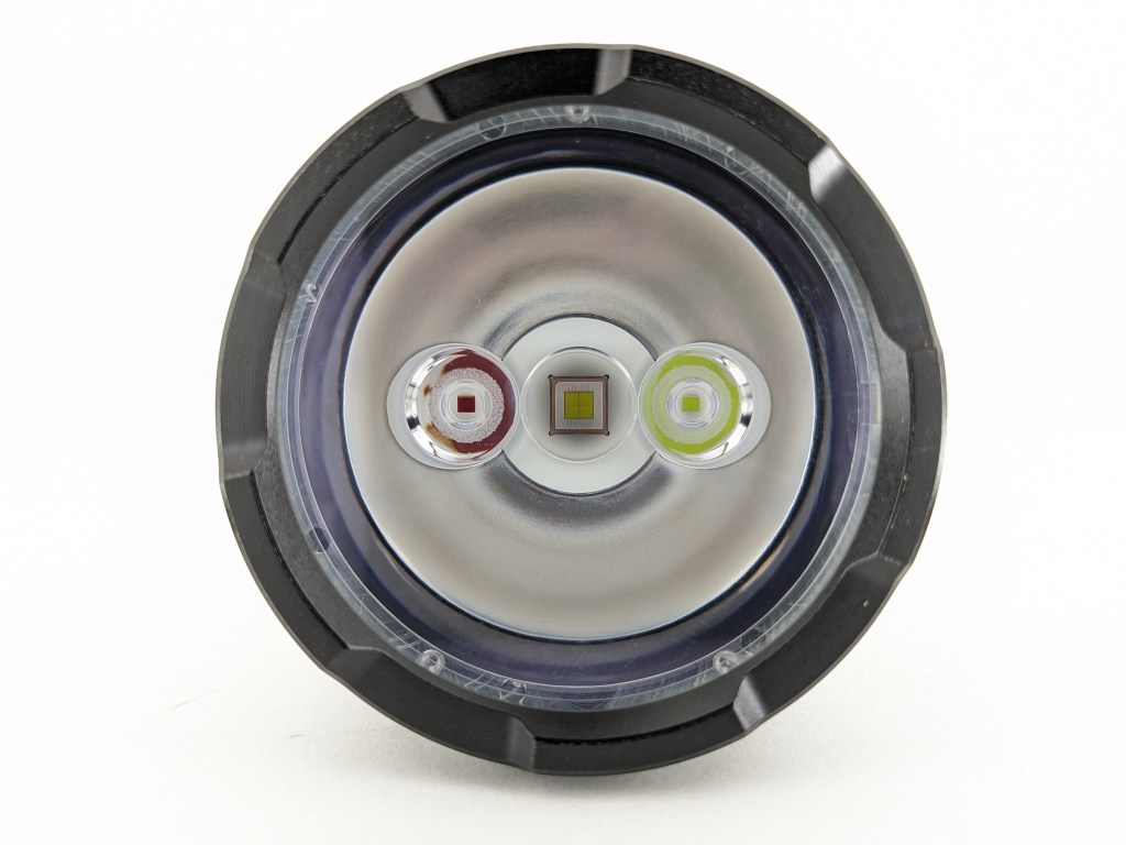 HT32 has three emitters. The main white one is a Luminus SFT70 in cool white, standard CRI. It may not have impressive color properties but it’s efficient and intense. I really like it in my EDC Olight Warrior 3S and I think it’s a great fit here. It necessitates a boost driver, which is great for efficiency and regulation.