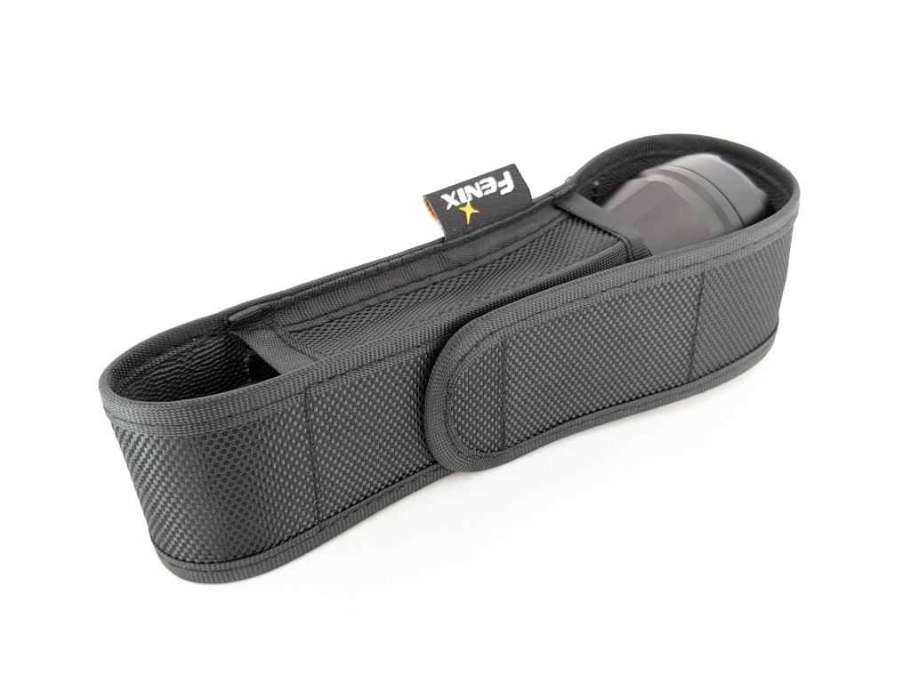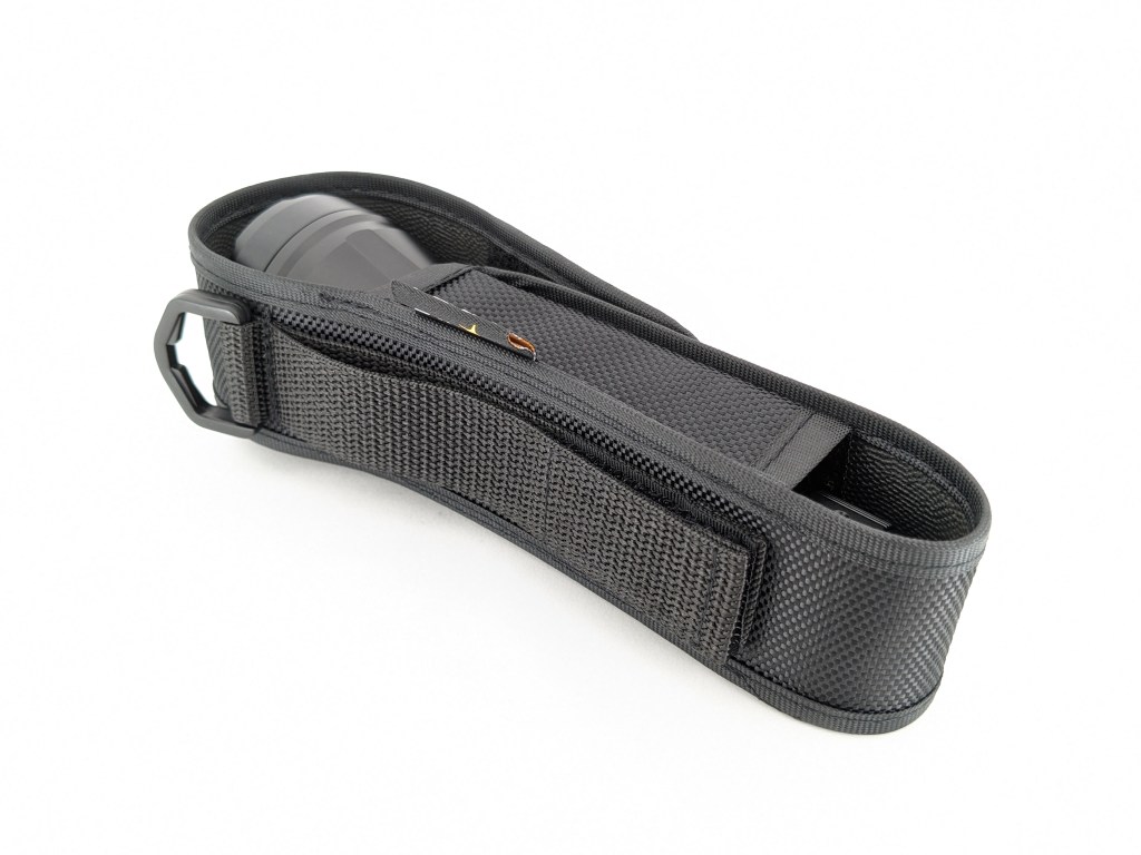 Two carry methods are included with HT32: a wrist lanyard that attaches to the tail, and a holster that attaches to your belt. The holster is made of black nylon with a velcro closure and a D-ring on top. There are two belt loops, one fixed, and one that can be opened by velcro to attach/remove it easily. It’s a plain, traditional holster.
