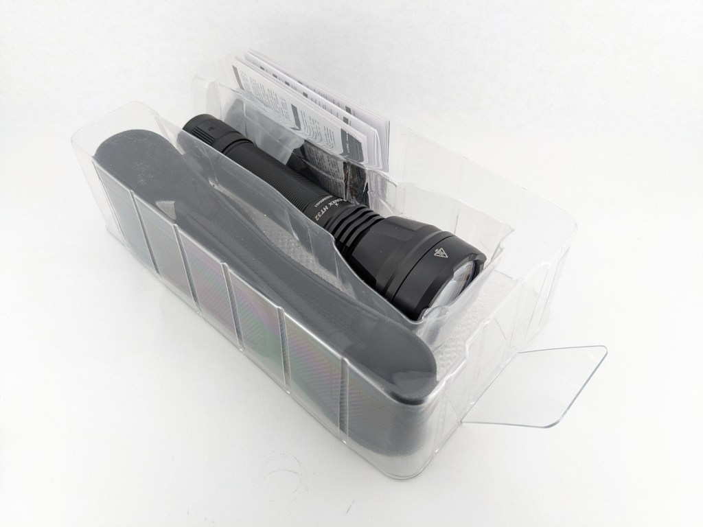 The box is fairly large, black, and designed for retail. It’s got nice black and orange printing all over showing the light and its features. Inside, the light is held in place by a thin vacuum-formed clear plastic insert. All the accessories sit underneath.