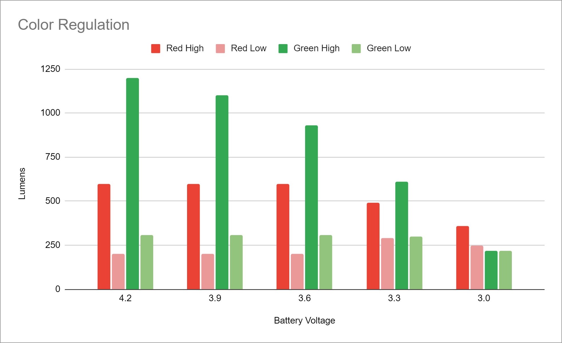 Regulation performance isn’t as good as I expected for a boost driver. This is good, but about average. Curiousy, the Red Low mode got slightly brighter as the battery neared empty. That was the case at the end of my Red High runtime test too.