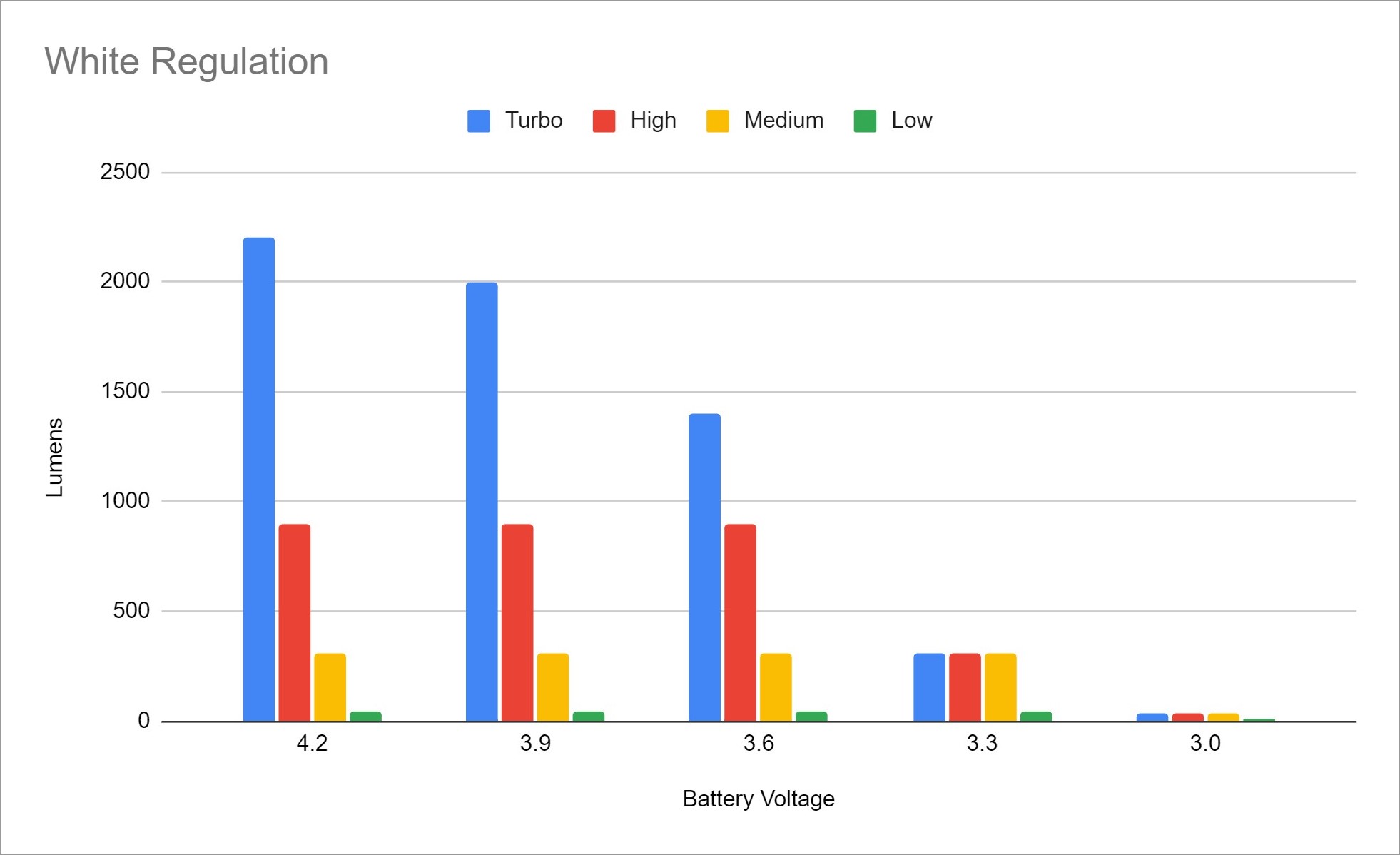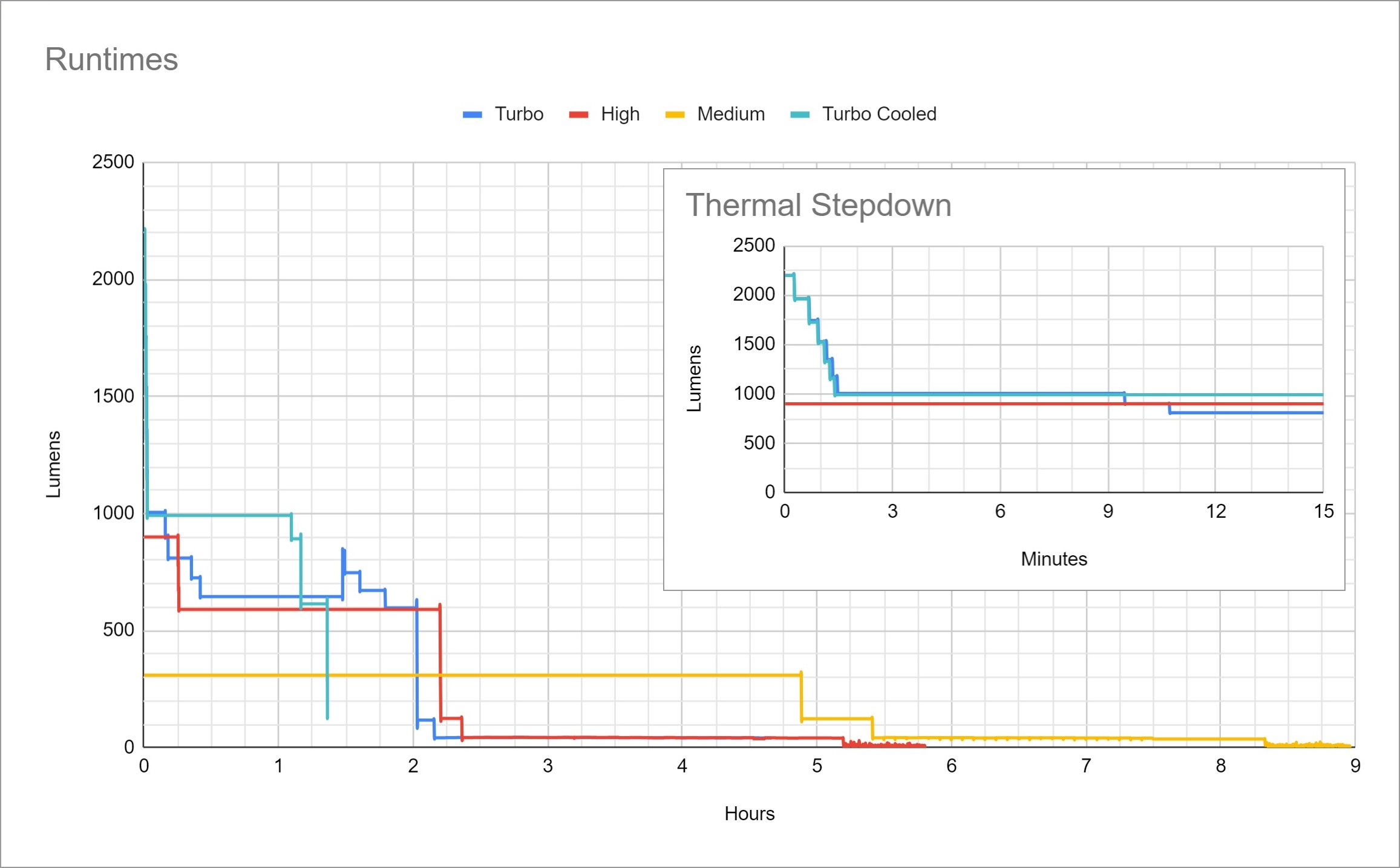 Thermal regulation: The Turbo stepdown appears to start instantly, possibly timed. However, after the initial stepdown, there is active thermal regulation. When cooled by a fan, the light held 1000lm for over an hour.