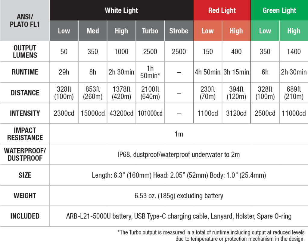 | Level | Lumens | Candela | Throw (Meters) | CRI (Ra) | Color Temp. (K) | DUV (Tint) |