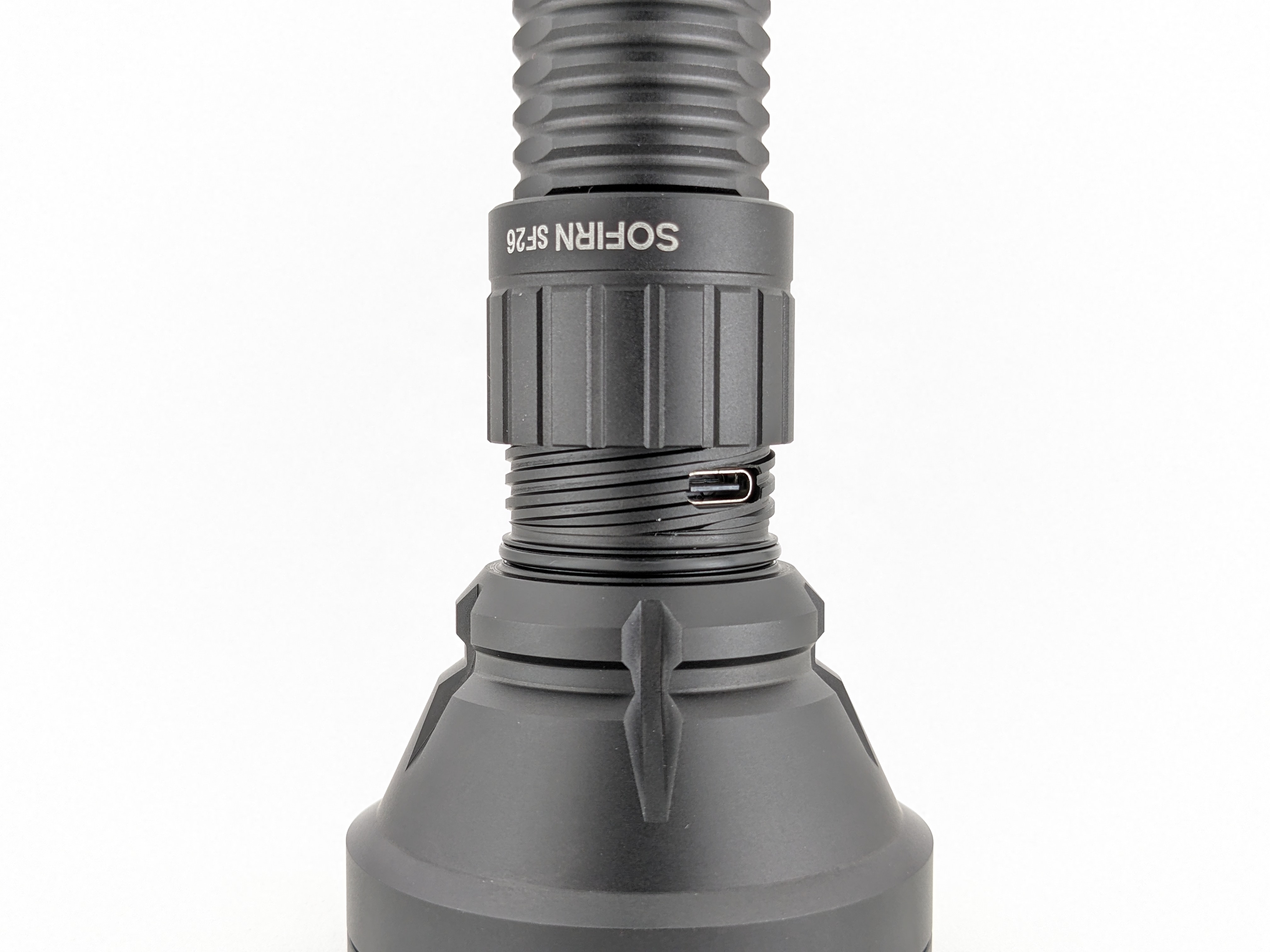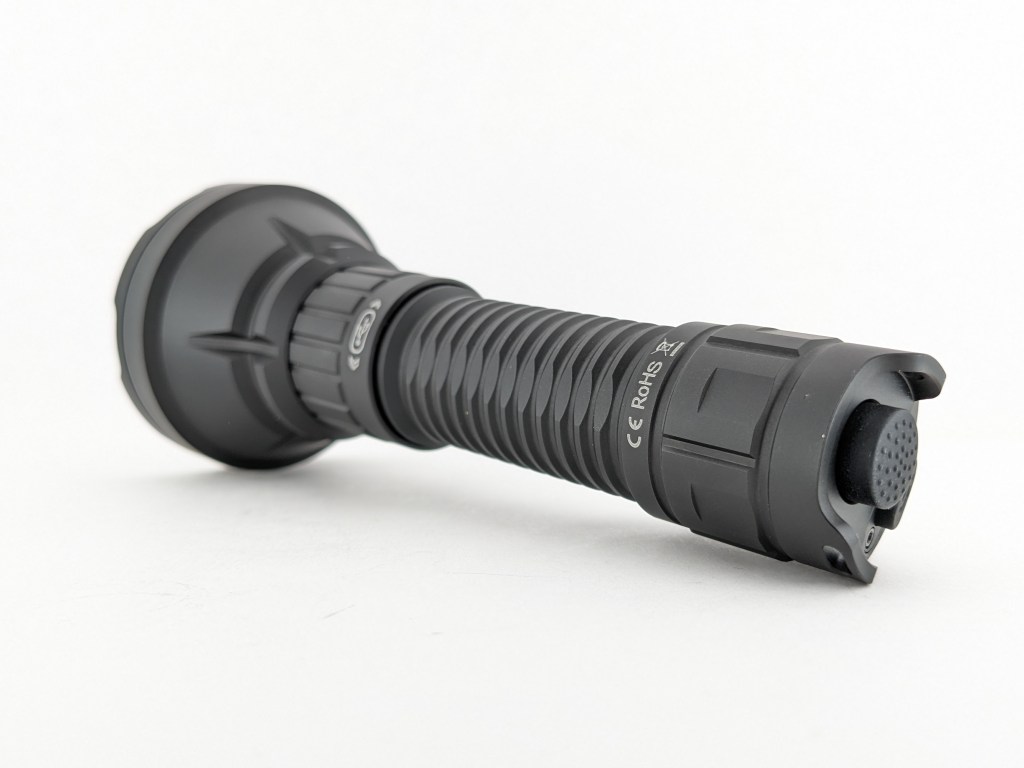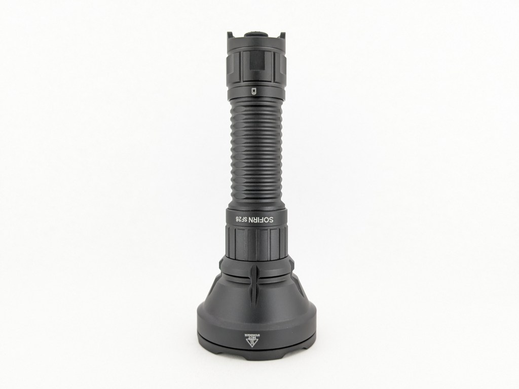 At first glance, SF26 looks like a typical medium-sized thrower. Upon closer inspection, you’ll notice the large TIR lens, dual-tail switches, and a charging port hidden under a threaded sleeve.