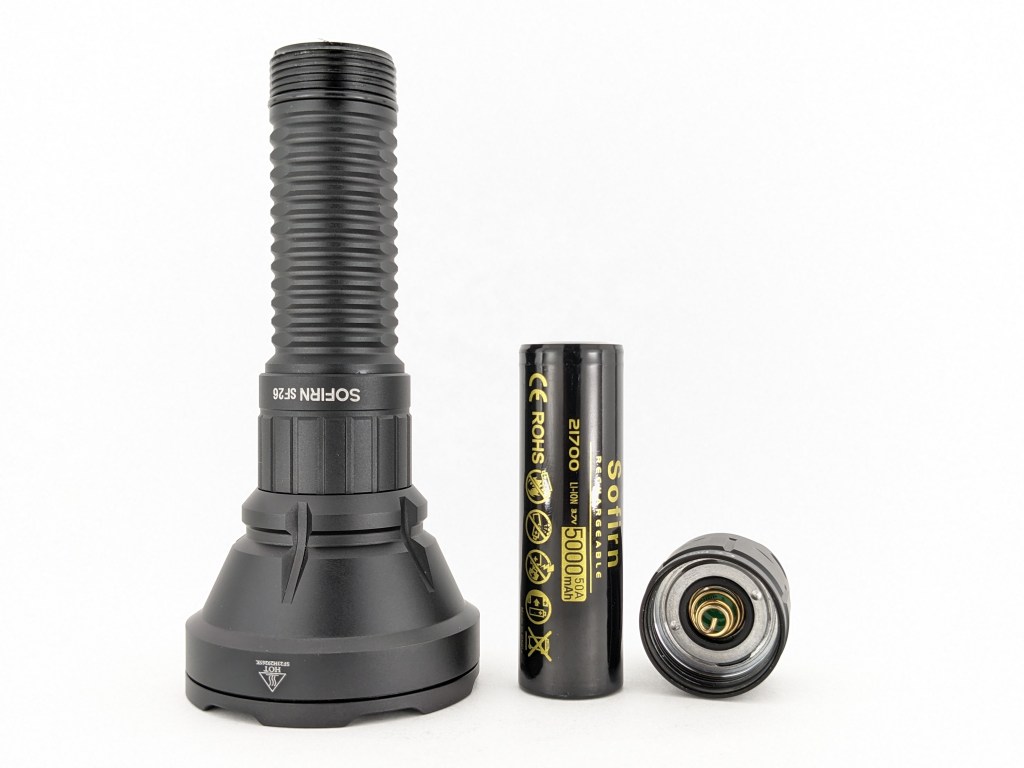SF26 is designed to take a single 21700 cell. An unprotected flat-top cell is optionally included and will do the job just fine. Protected cells will fit, but just barely, and only if they don’t have a built-in charging port. Any 18650 cell will fit and work but may rattle a bit side to side.