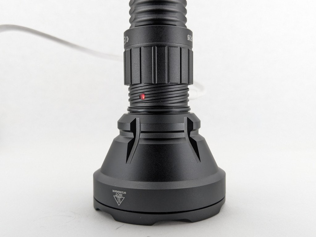 The charging indicator sits directly opposite the USB port underneath the threaded cover. It’s only visible when the cover is retracted. While charging, it glows red. When charging is complete, it glows green. It also glows green or red for a few seconds after you turn the light on to indicate the battery status, but you can only see it when the cover is retracted. I wish it were located elsewhere so I could see it without having to open the cover.