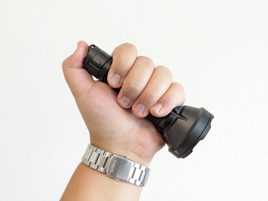SF26 fits fine in the hand and is ergonomic enough. It fits best in a reverse or cigar grip, but a forward grip works too if you use the other hand to control it. I don’t like the ears on the tailcap very much because they can make it difficult to access the switches comfortably.