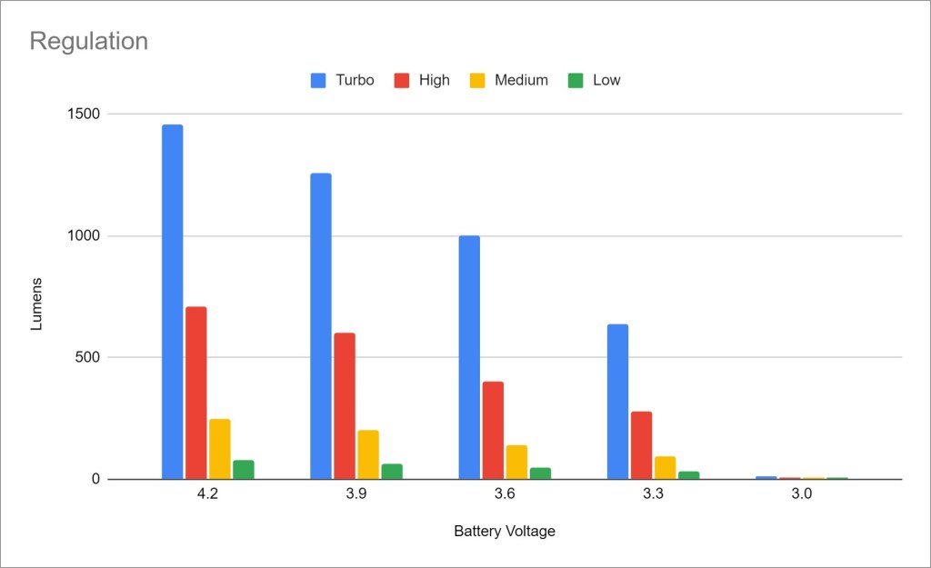 Thermal regulation: There appears to be little to no active thermal regulation, just a timed stepdown. That’s highly unusual for Sofirn, as every single Sofirn model I’ve tested until now has had highly active thermal regulation that responds quickly to temperature changes. No active thermal regulation means the light will perform more consistently but may also overheat in hot weather or leave some performance on the table in cold weather.