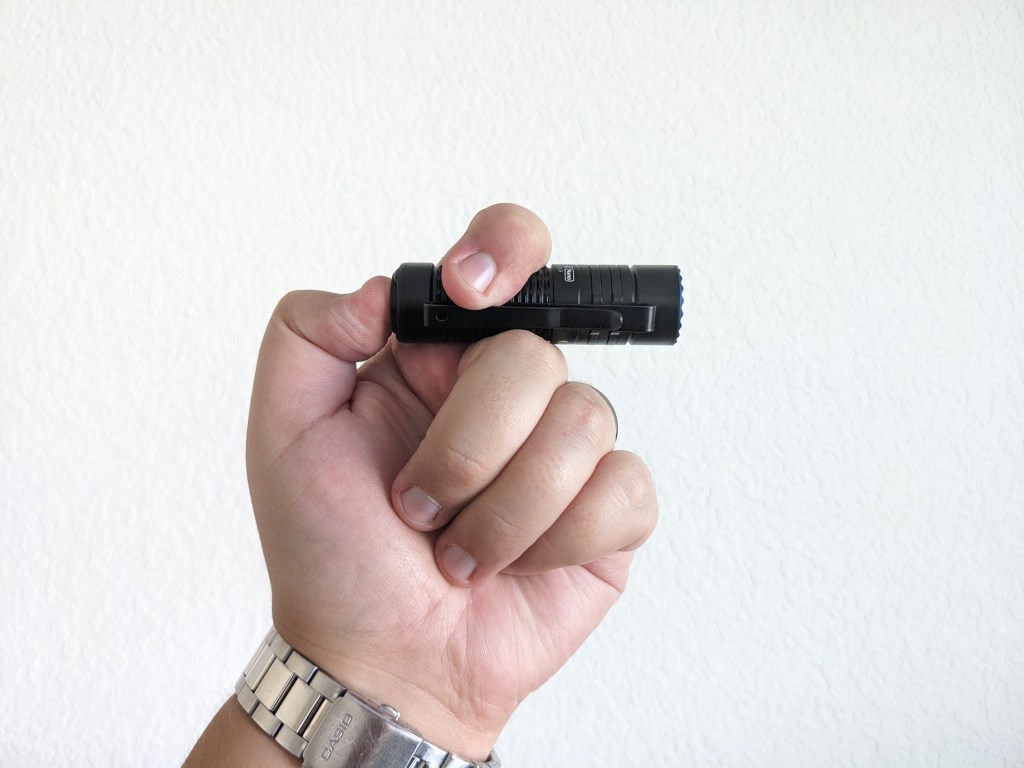 This is a small light so it carries pretty well, especially if you like bezel-up carry. It’s great for that. Bezel-down is not so great. It’s difficult to get the clip started because my pocket often either snags before it reaches the mouth of the clip, or it’s too thick and I have to manually open the mouth of the clip to get it over my pocket. With some practice, I can pocket it fairly easily now, but I wish that the clip was redesigned (as shown below) or that the Warrior Mini 3 Bezel-Down Clip Adapter was included in the box because it works with this light.