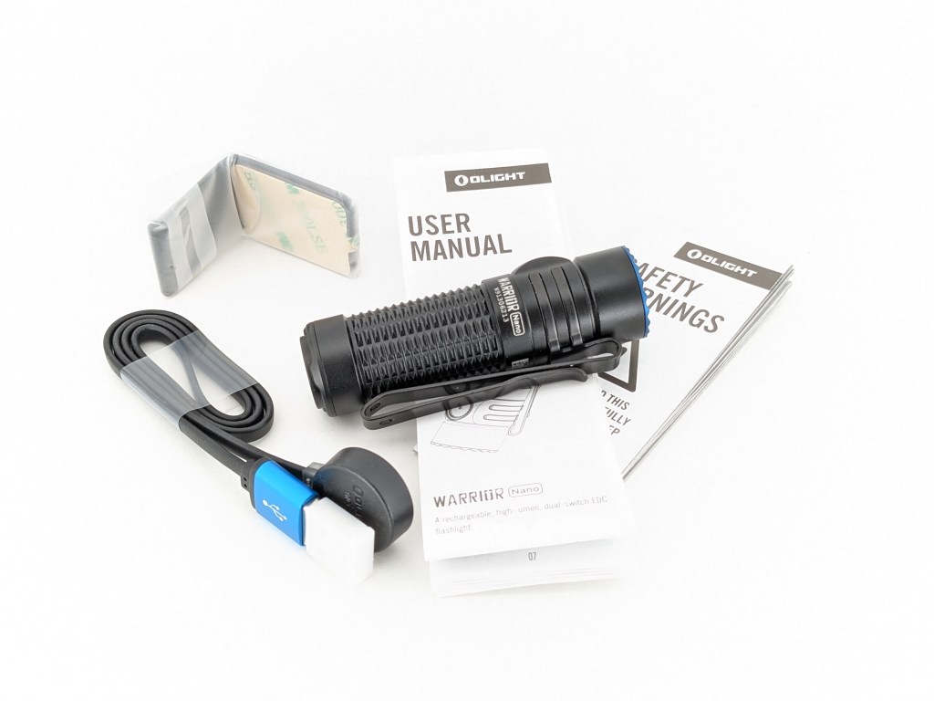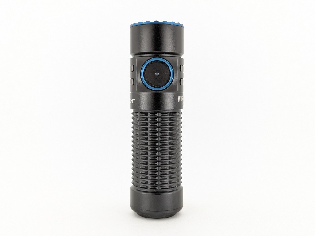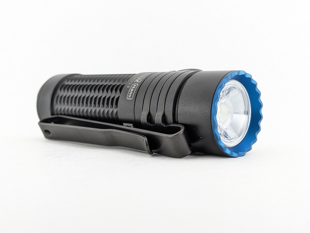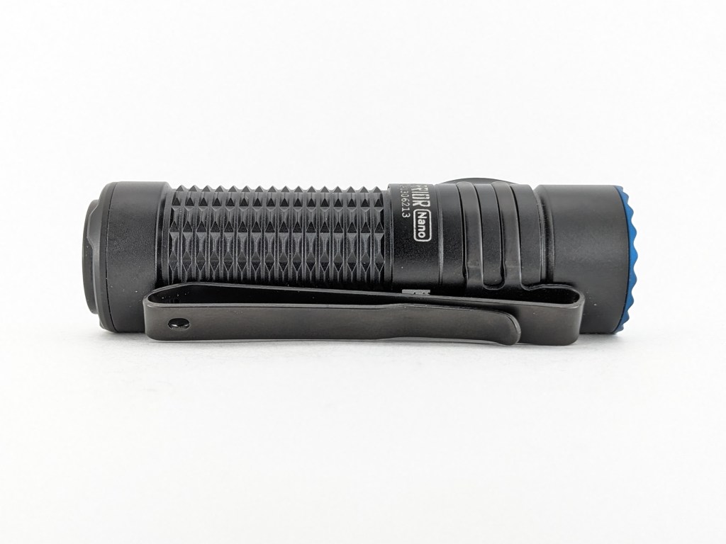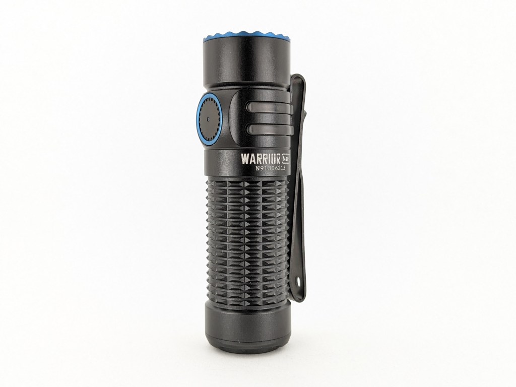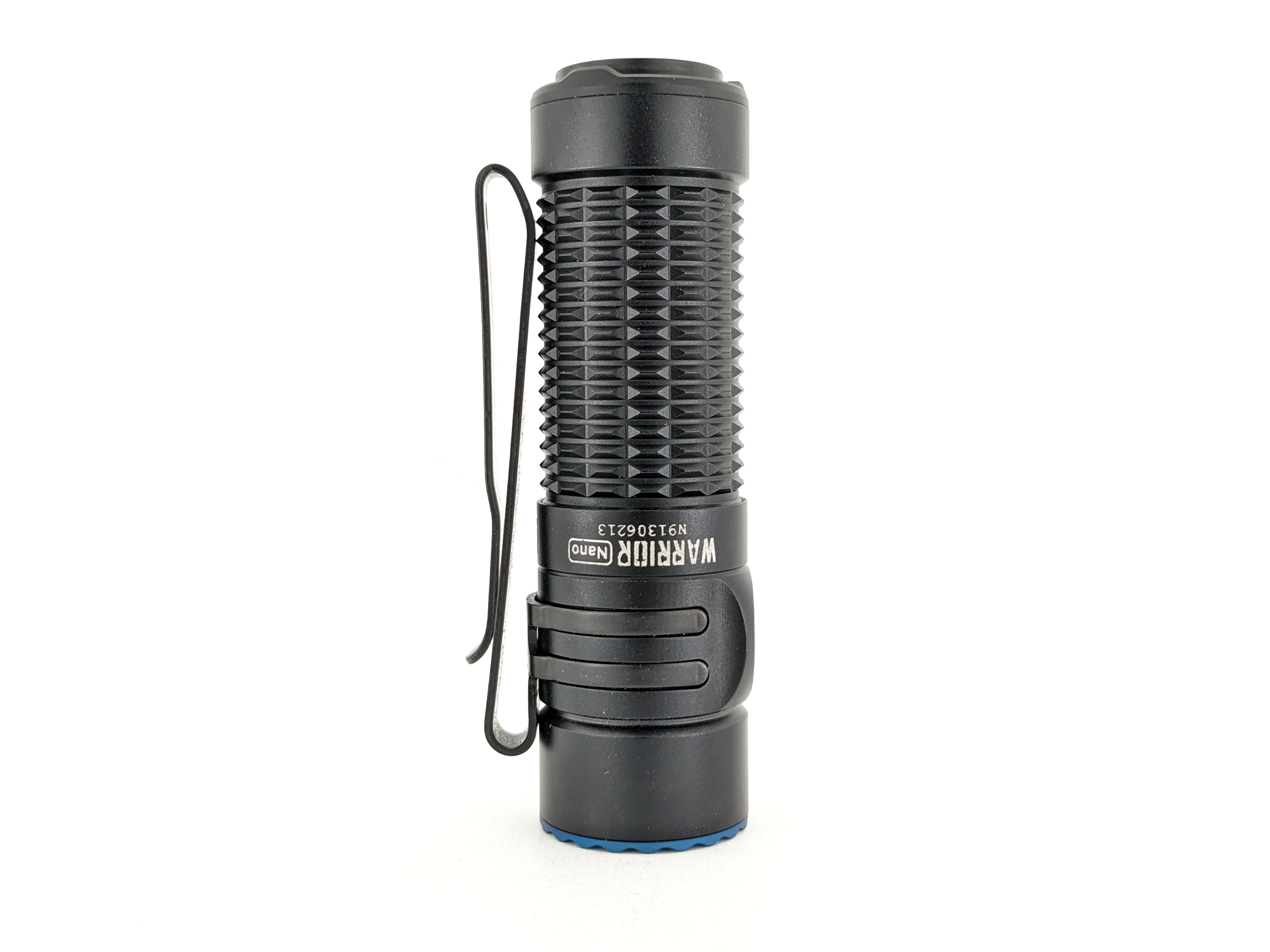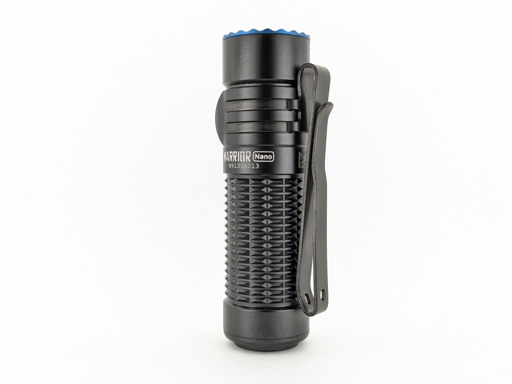 Warrior Nano looks exactly like a Warrior Mini 3 with a shorter body tube and slightly smaller pocket clip. It’s got a lot going on but Olight did a good job making it look clean. It’d be nice if this black version didn’t have the blue accents though.