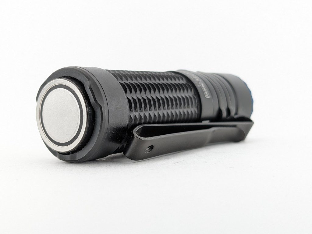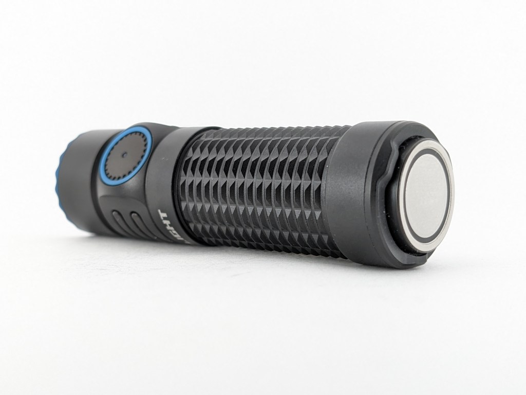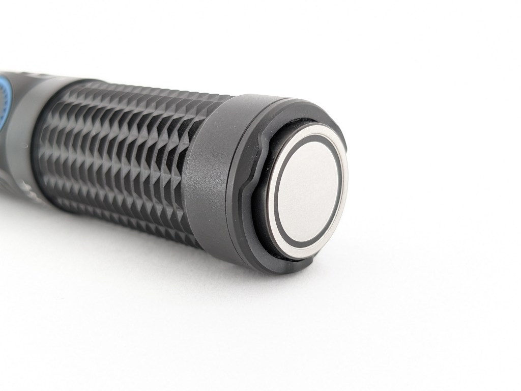 The tailswitch is metal and slightly concave. It’s not quite as tactile as previous generations of Warrior series lights, but it works well and makes tail standing easier. It’s also easier to clean if you get it dirty. There’s a strong magnet inside the tailswitch that allows you to stick the light to ferrous surfaces.