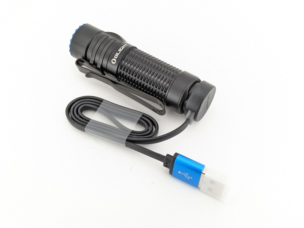 Charging is facilitated by Olight’s proprietary magnetic tailcap charging system. A USB-A charging cable is included that magnetically snaps onto the tailcap of the light. The puck has an LED indicator that glows red while charging and glows green when not charging. It’s easy to see but it’s a little too bright to have on your nightstand at night. The light is usable while charging.
