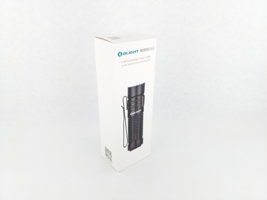 This is the simpler of Olight’s two box designs. It’s made of folded white cardstock with high-quality printing showing details about the light. Inside, the contents are held in place by a vacuum-formed plastic insert.
