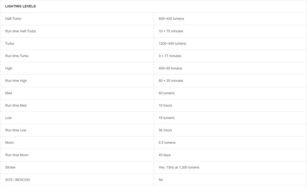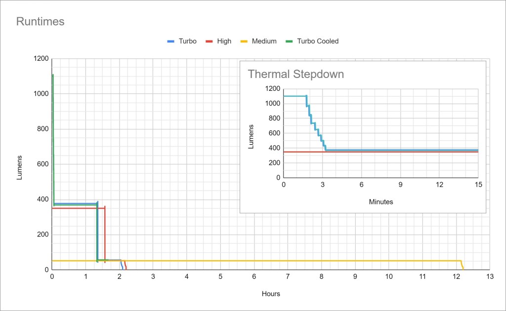 Thermal regulation: Timed step-down from Turbo only. No active thermal regulation. That means the light will perform very consistently but may also overheat in hot weather or leave some performance on the table in cold weather.