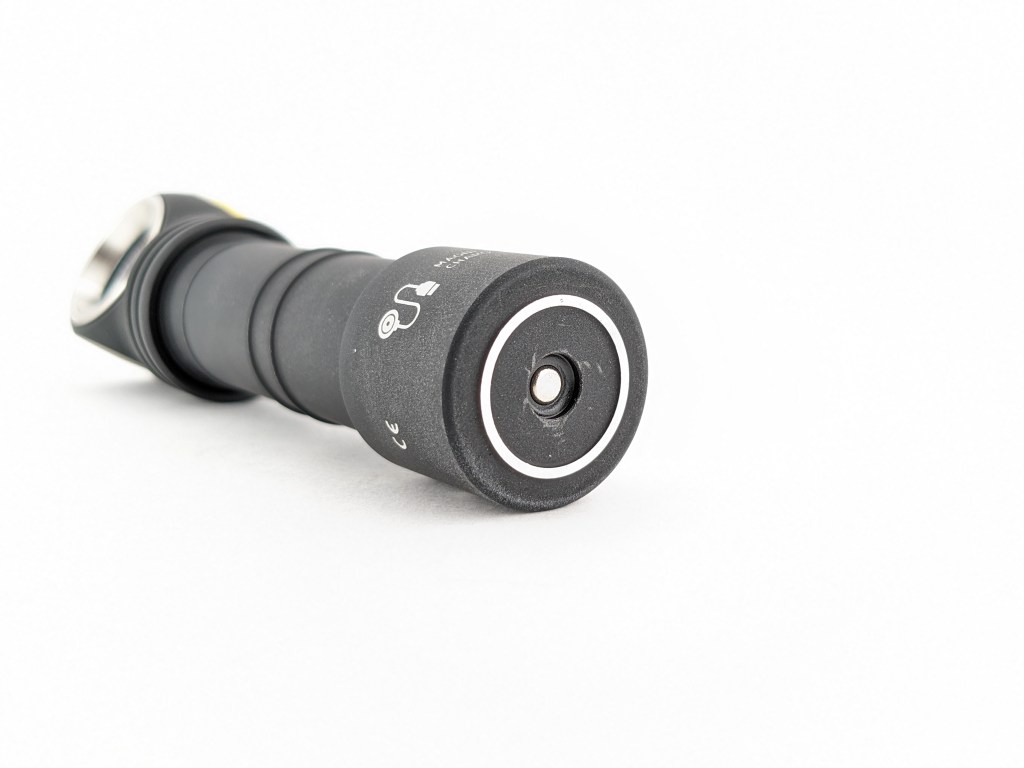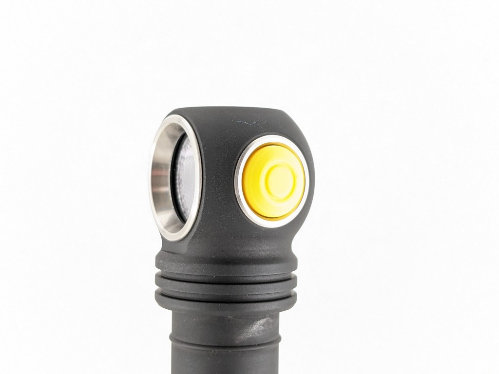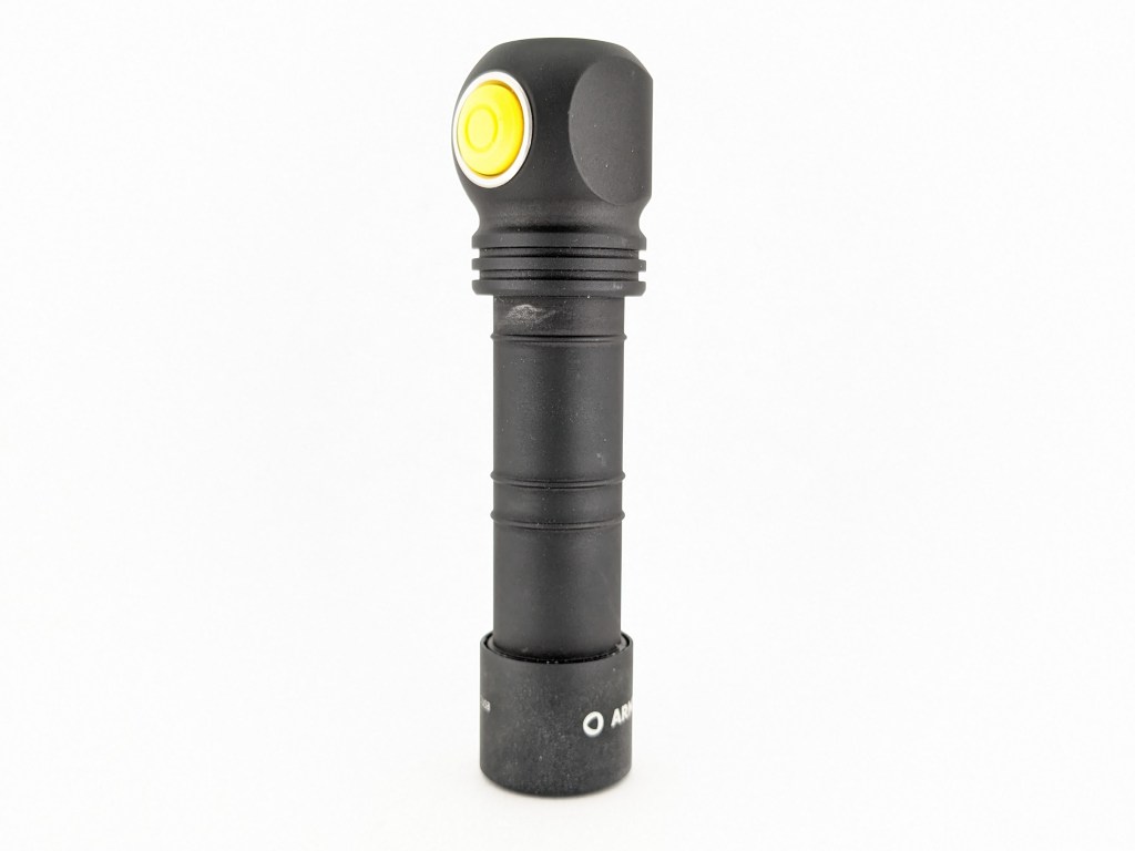 The switch is electronic and located on the side of the head. That’s ideal for headlamp use, but a bit awkward for handheld use. The switch is covered by a bright yellow rubber boot and it’s easy to find even in the dark. The action is both tactile and audible.