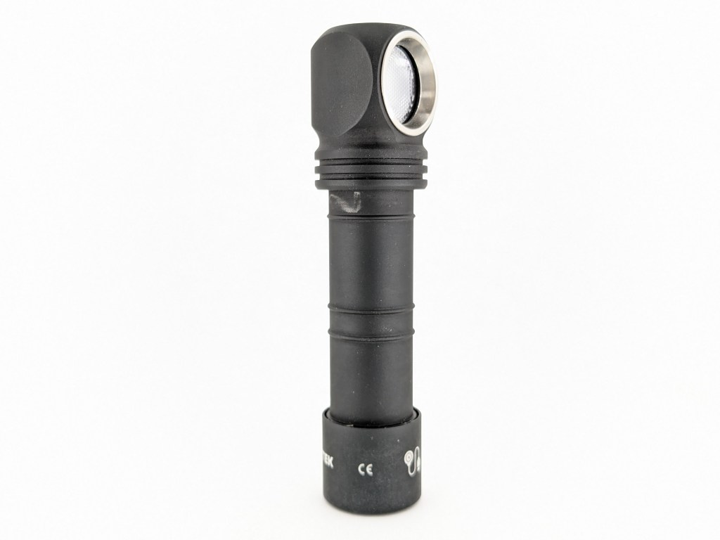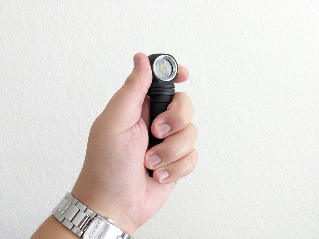 Handheld ergonomics are so-so. It fits fine in my hand and I can use it, but the switch is a little awkward to access. Right-angle lights with the switch on the end usually work better as handhelds. The uncomfortable chalkboard anodizing is another “issue” for handheld use.