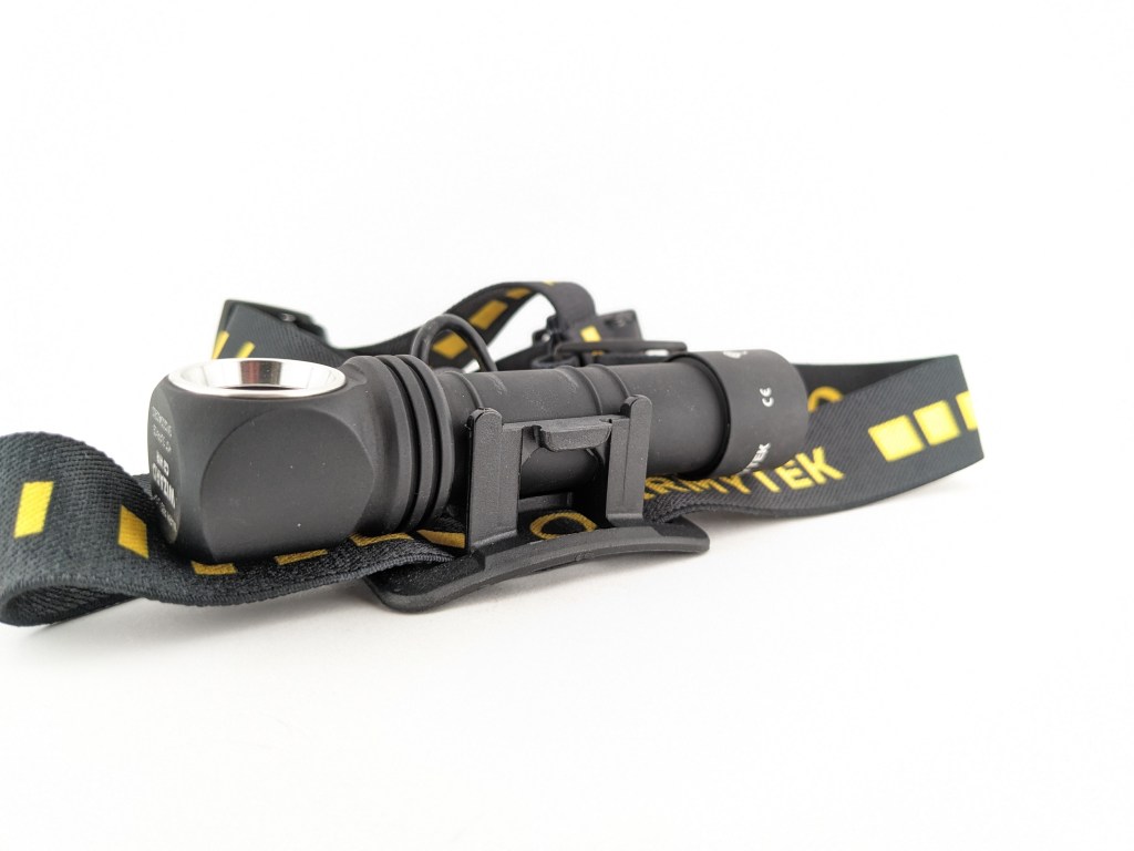 An above-average headband is included for headlamp use. There’s a plastic bracket in the front that the light snaps in/out of fairly easily. There’s also a rubber loop you can hook around in front of the light to hold it extremely secure. The straps are elastic with some yellow stripes, but no retroreflectors or silicone grip pads like some other headbands. I can’t find a non-destructive way to remove the top strap and you cannot use the pocket clip and headband simultaneously.