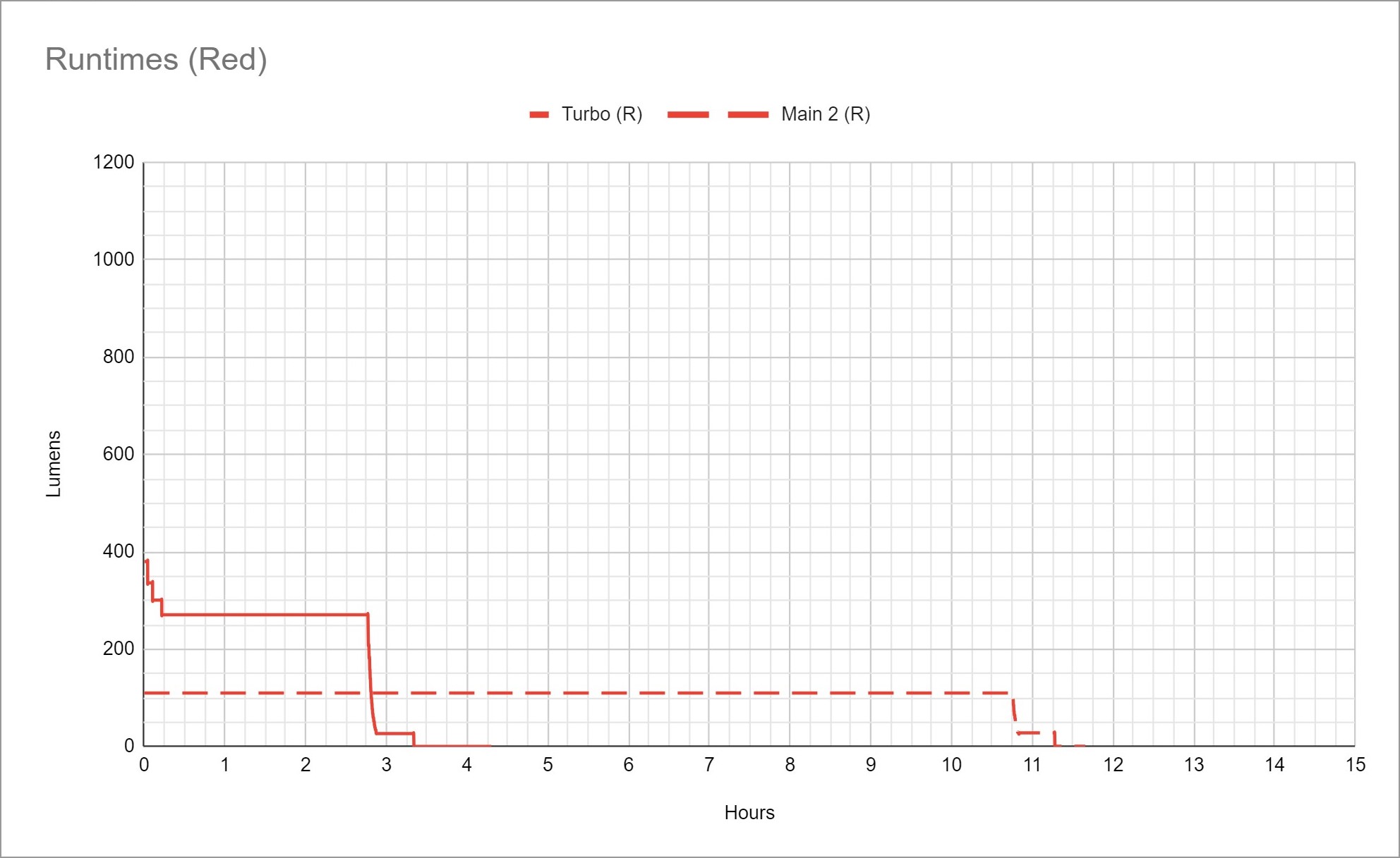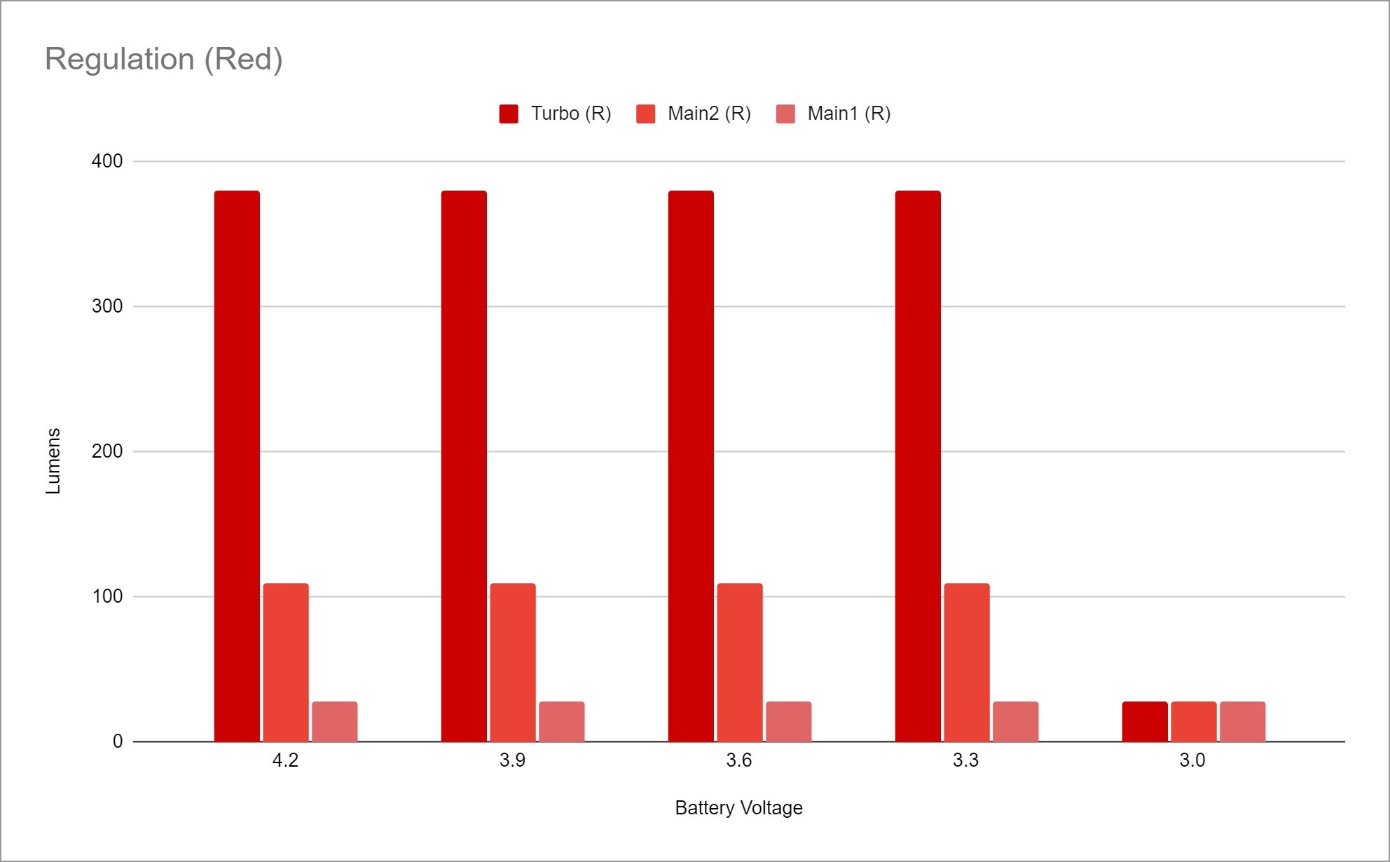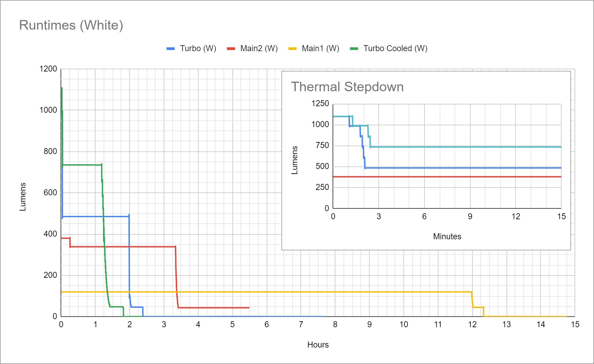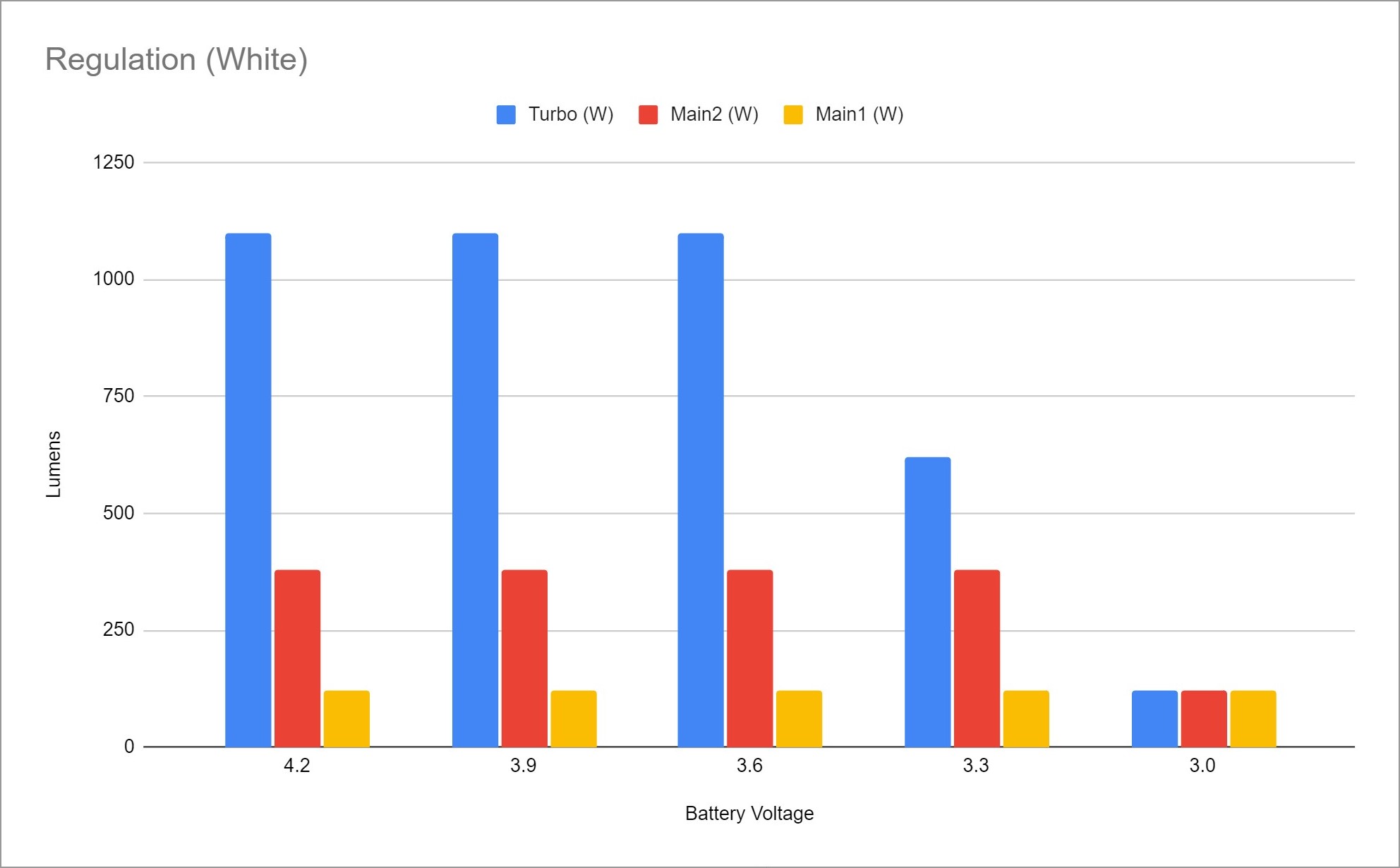 White light performance is respectable. Turbo lasts 1-2 minutes before stepdown and stable output is 500 lumens in still air. The output at all levels is extremely stable besides expected temperature and voltage stepdowns.