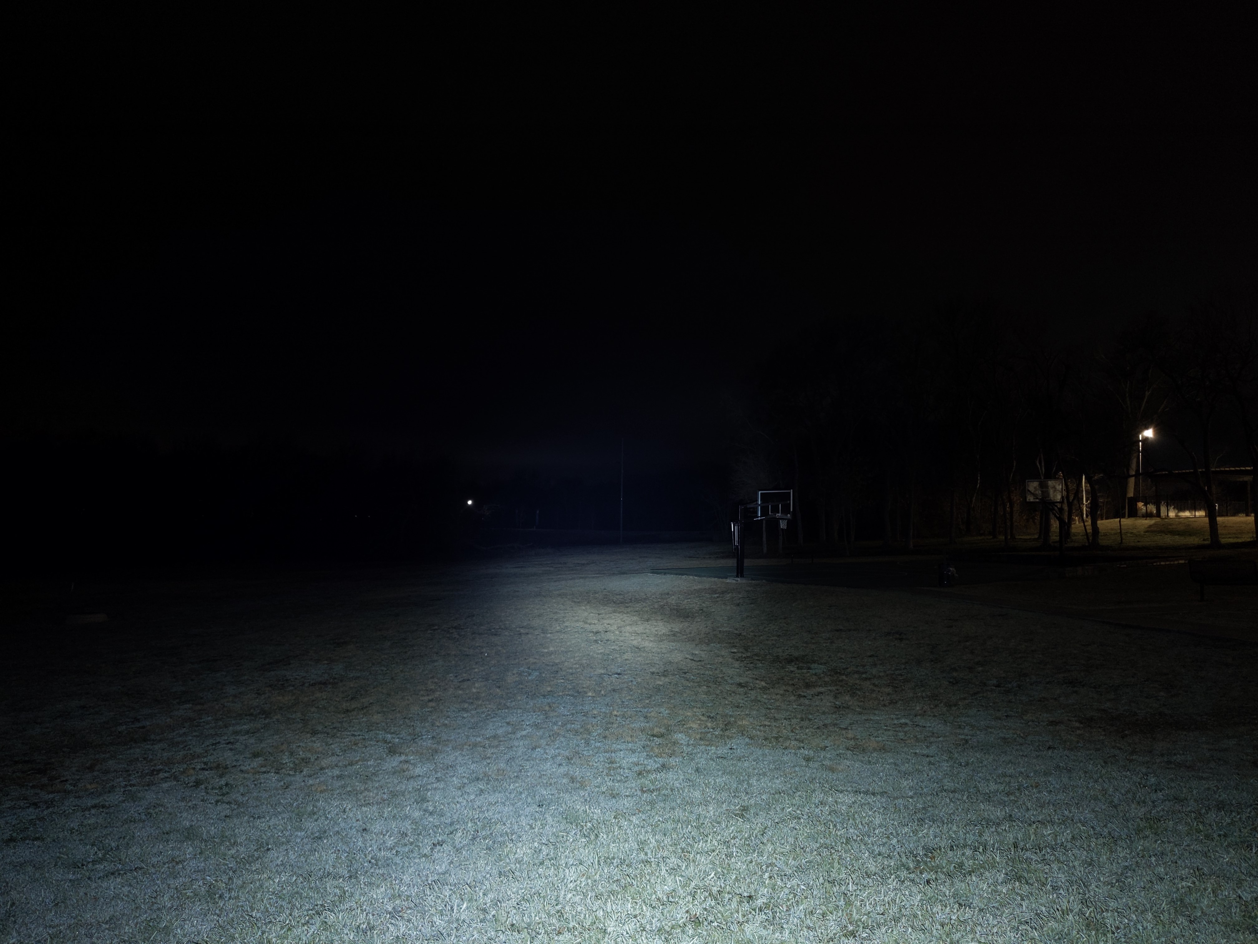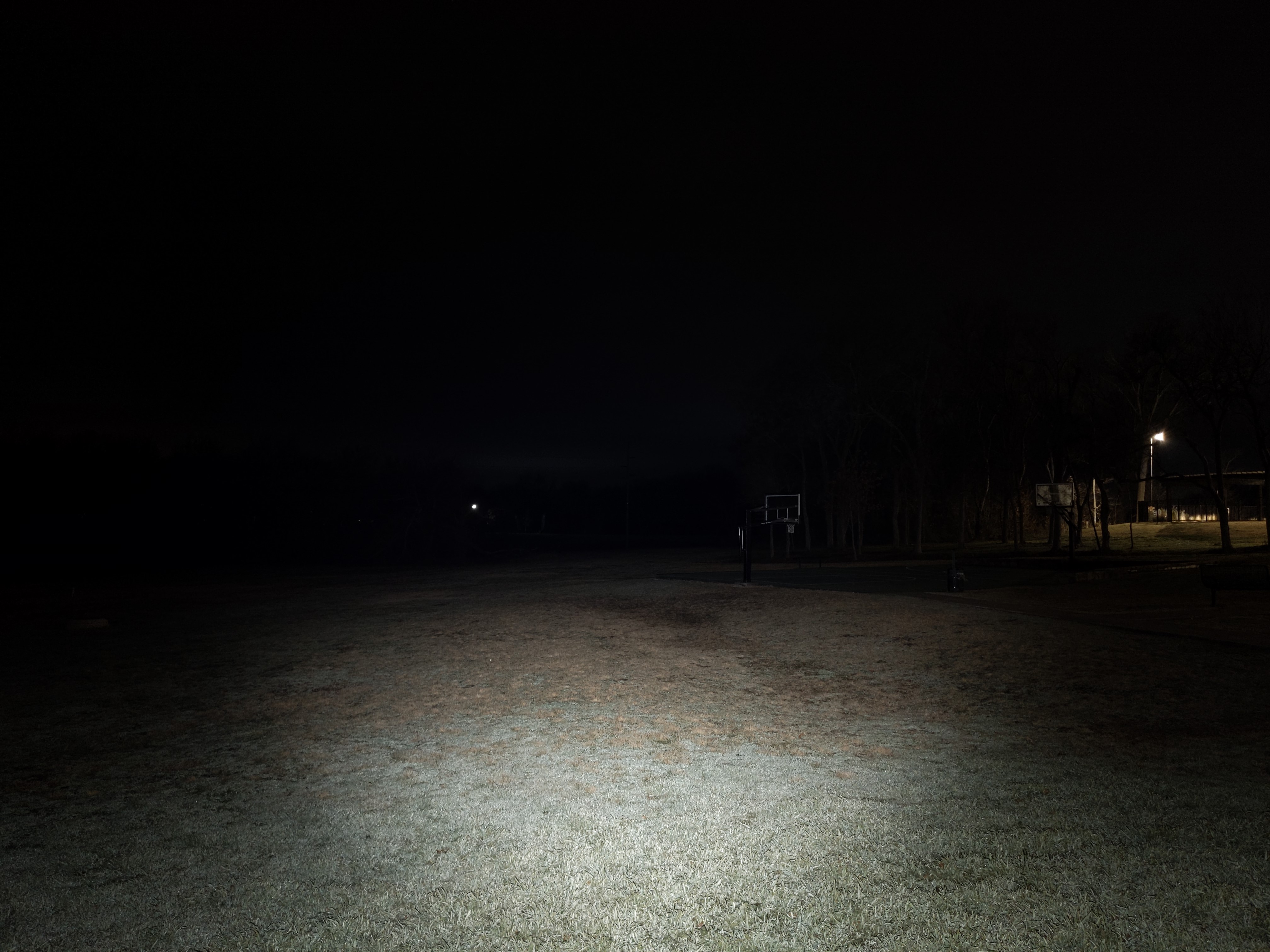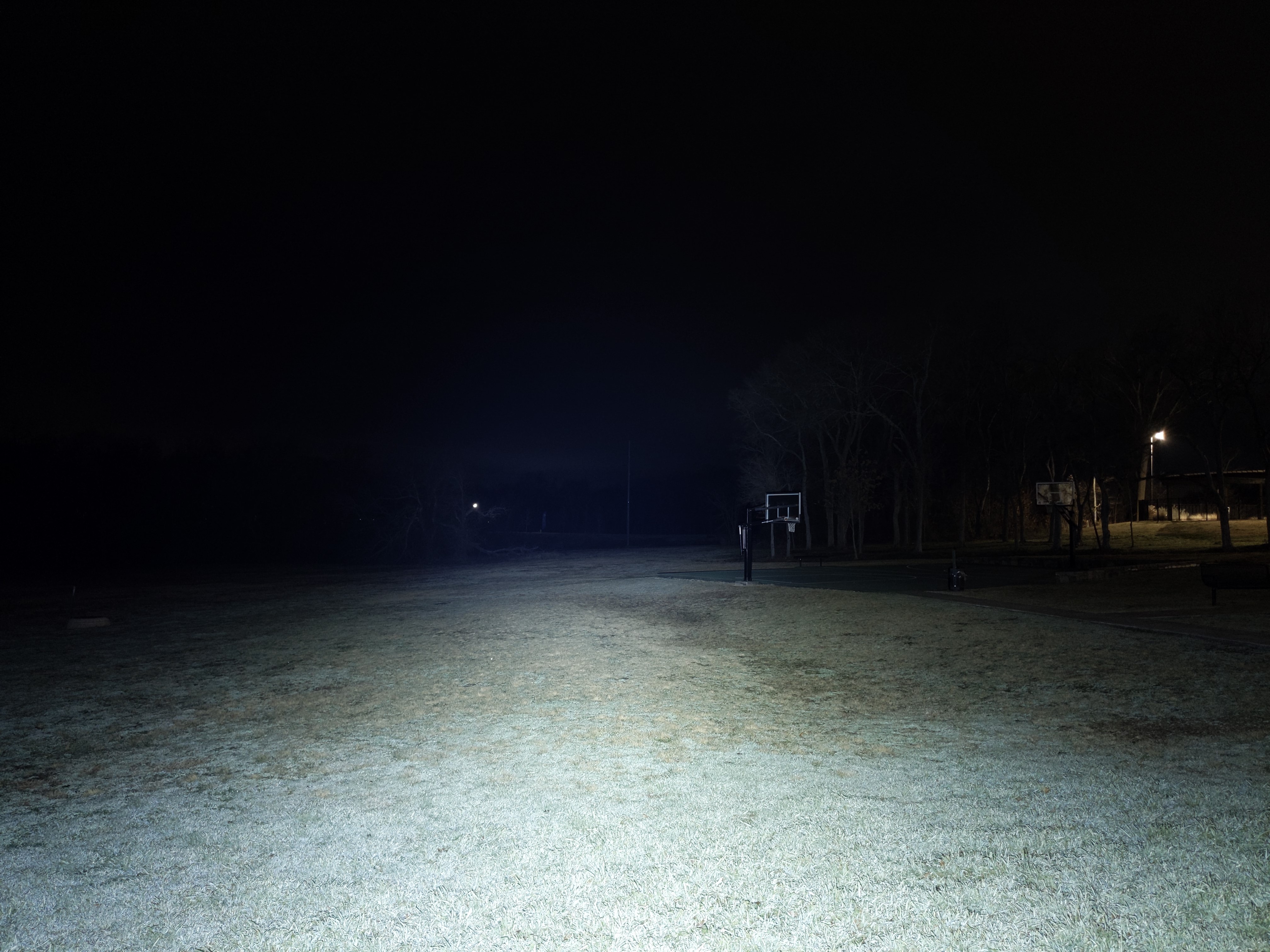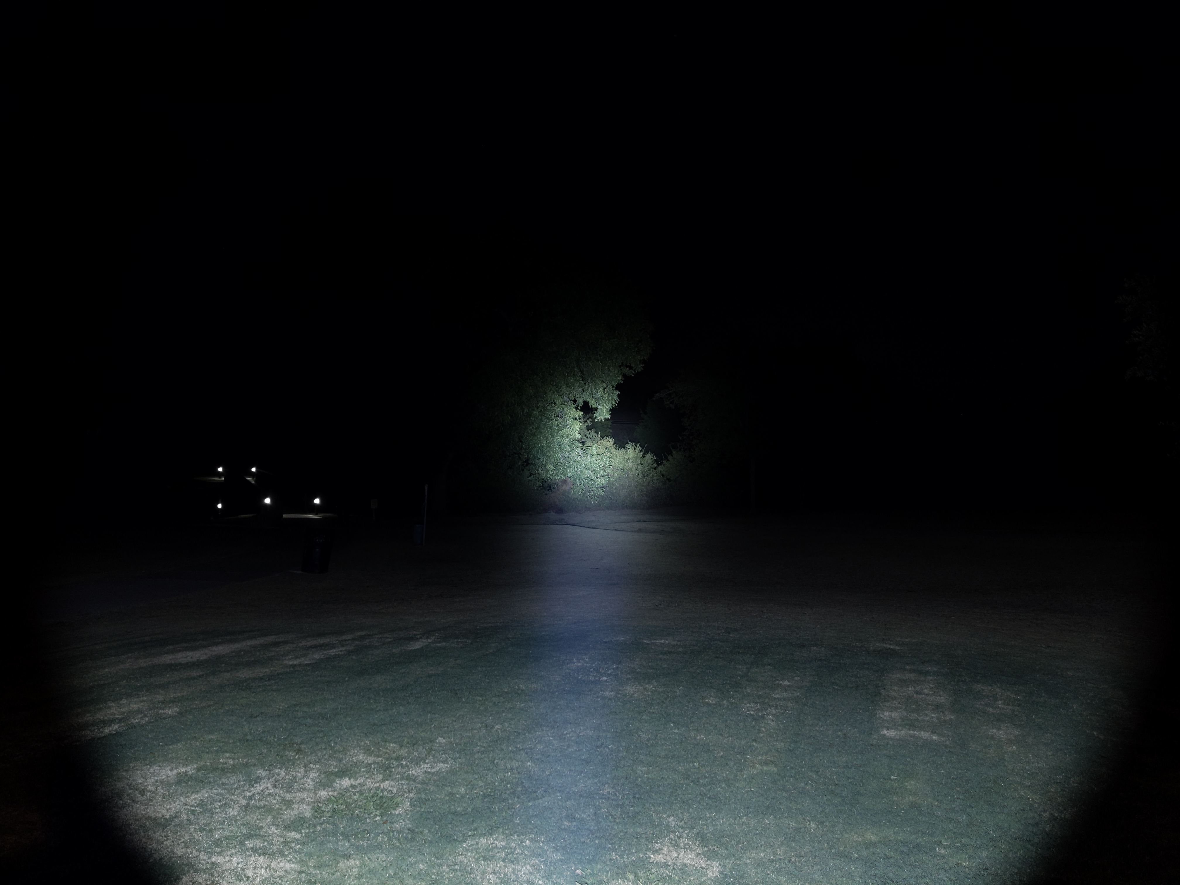 The Spot LED has a round die instead of a square, which is cool. I think that’s what makes the spot beam round even though it’s paired with an aspheric projection lens. It’s an OK beam but it’s just not as bright as I want it to be. There’s also a lot of tint shift, and it’s got some artifacts outside of the hotspot. Perhaps my Acebeam Terminator M2’s crisp, clean spot beam has spoiled me.