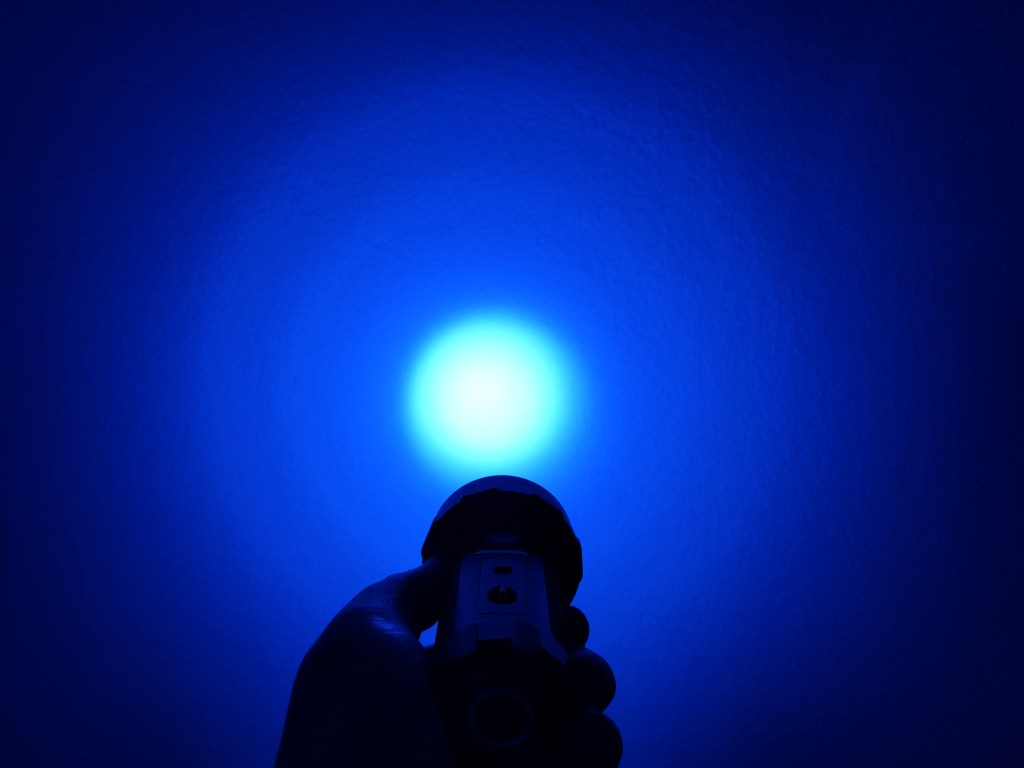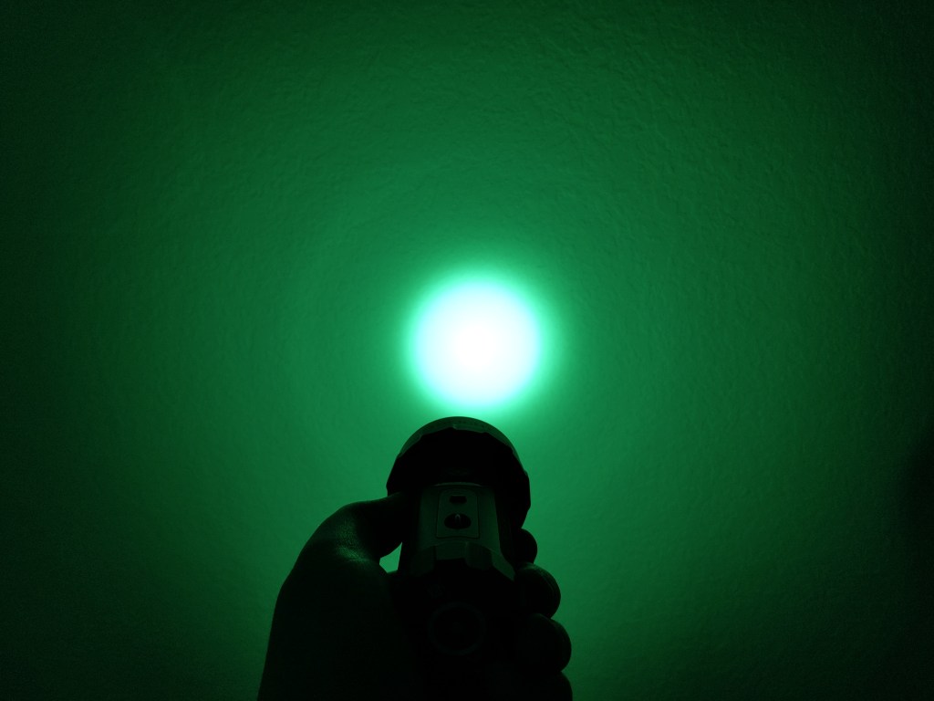 Regulation performance for white light is ok. It’s not great, but it’s about what I’d expect from a “7000 lumen” single-cell flashlight. You really only get full brightness performance with a near-full battery, even in the low-output spotlight channel. Generally, I like to see full brightness achievable with a half charge or more. The colored LEDs provide full output until the battery is near empty. This is advertised as a 7000-lumen light, but it’s really more of a ~2500-lumen light with a 5000-lumen bonus mode if the battery is full.