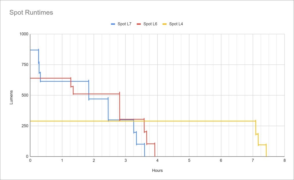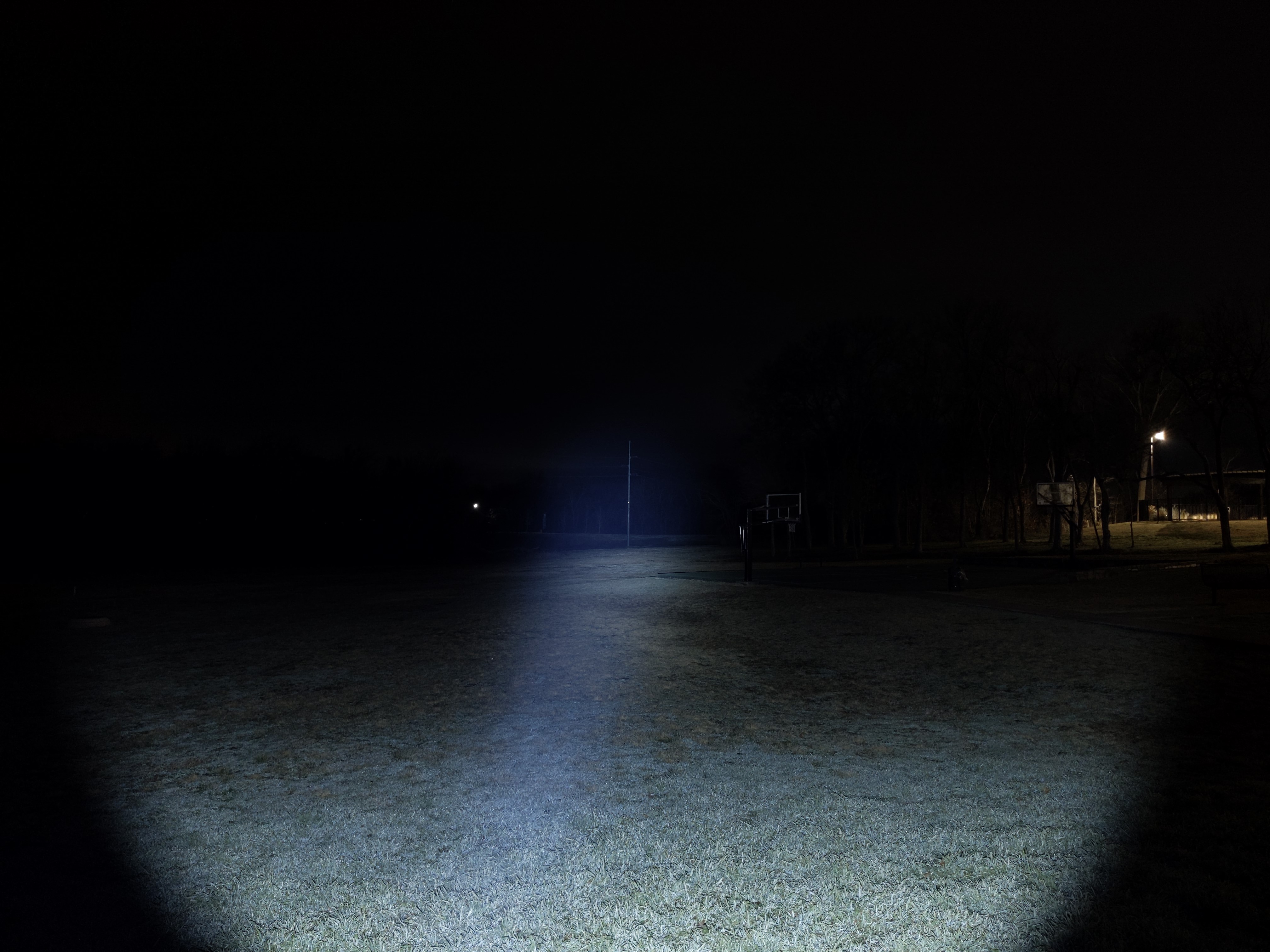 Disclaimer: All of my measurements are taken at turn-on. Lumen measurements were taken on a Texas Ace 3.5″ Lumen Tube. A candela measurement was taken at 10 meters with an Opple Light Master III on the highest brightness, and other candela figures were calculated relative to that. CRI, CCT, & DUV data were taken for each mode from a few feet away at the center of the hotspot with the Opple Light Master and Waveform DUV Calculator. Runtime tests were performed with the Ceilingbounce app on my smartphone. All of these tests were performed with a fully charged included battery unless otherwise specified. I cannot measure moonlight directly, so moonlight readings are calculated based on the brightness relative to the next-lowest mode. None of this is professional equipment, so take all of these measurements with a grain of salt.