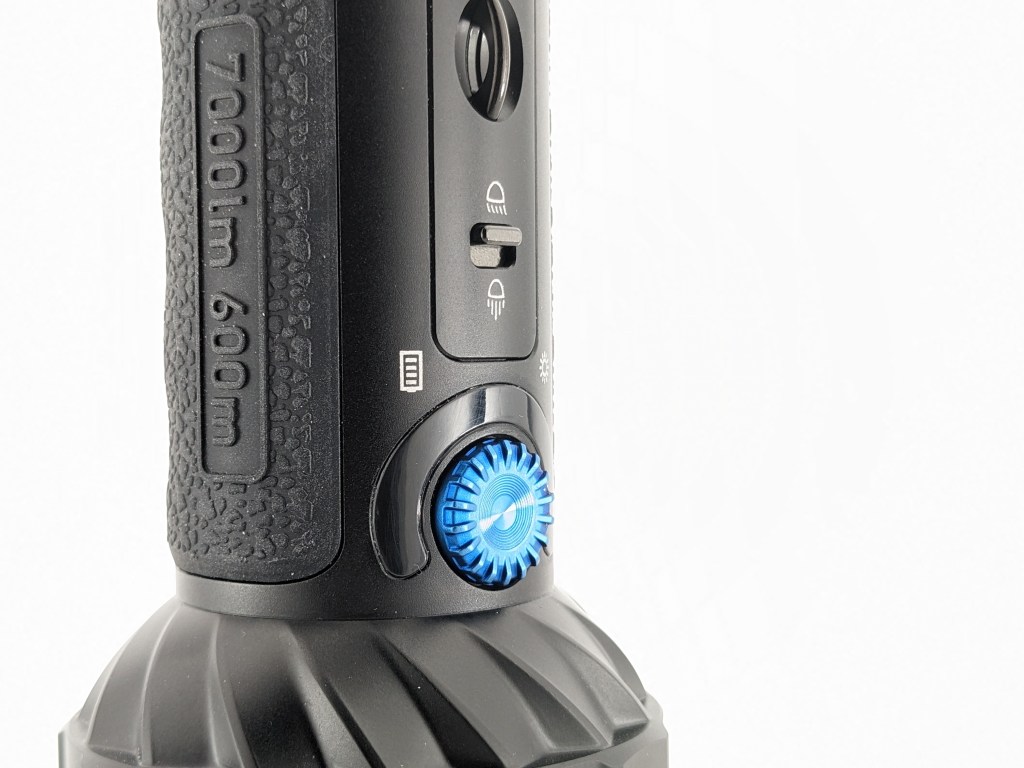 Marauder Mini has several controls. There’s a sliding toggle switch for switching between flood and throw, a rotary knob for adjusting brightness, and that same rotary knob pushes in like a button to control on/off and color changing. Here’s how it all works.