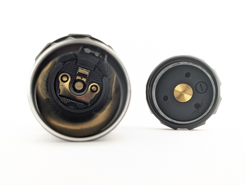 I’m not sure what kind of driver this light uses. Olights generally have good quality Buck or Boost drivers. I could not get any photos of the driver. You can see in the photo above that the driver has both positive and negative contact pads, and that’s why the proprietary battery is required.