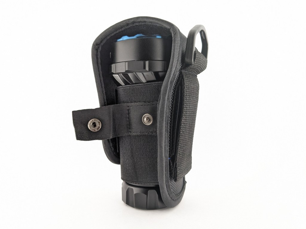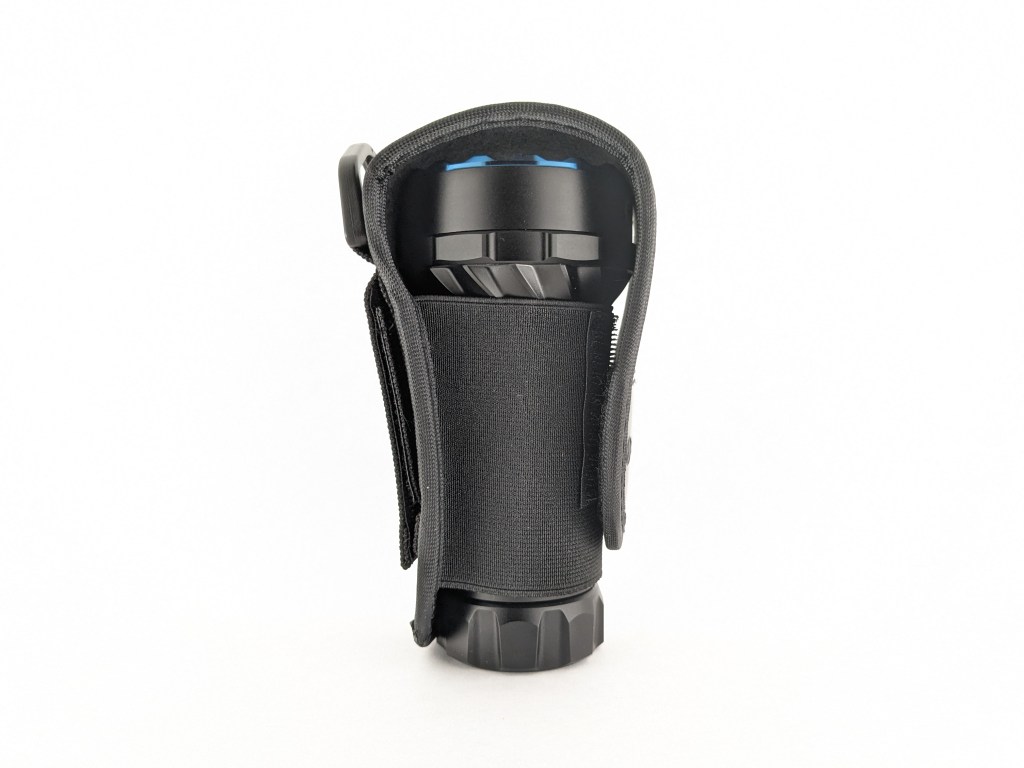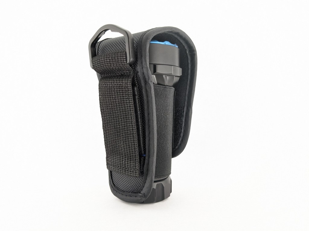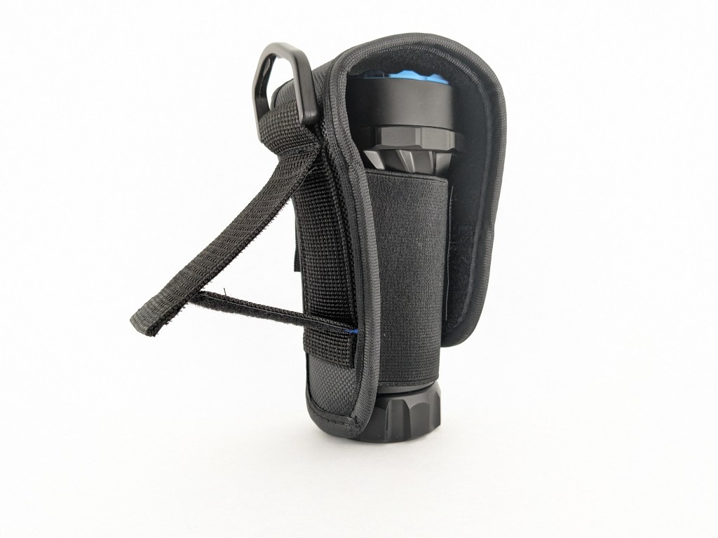 A holster is included to make it easier to carry. It’s a basic nylon holster with a velcro closure and elastic loop to hold the light. The belt loop closes with velcro so you can install/remove it from a belt without needing to un-thread the belt. There’s a small button-clasp loop that can hold the lanyard or charging cable when not in use. Finally, there’s a D-ring on the back for some reason. If you know why all flashlight holsters seem to have a D-ring like this, let me know in the comments!