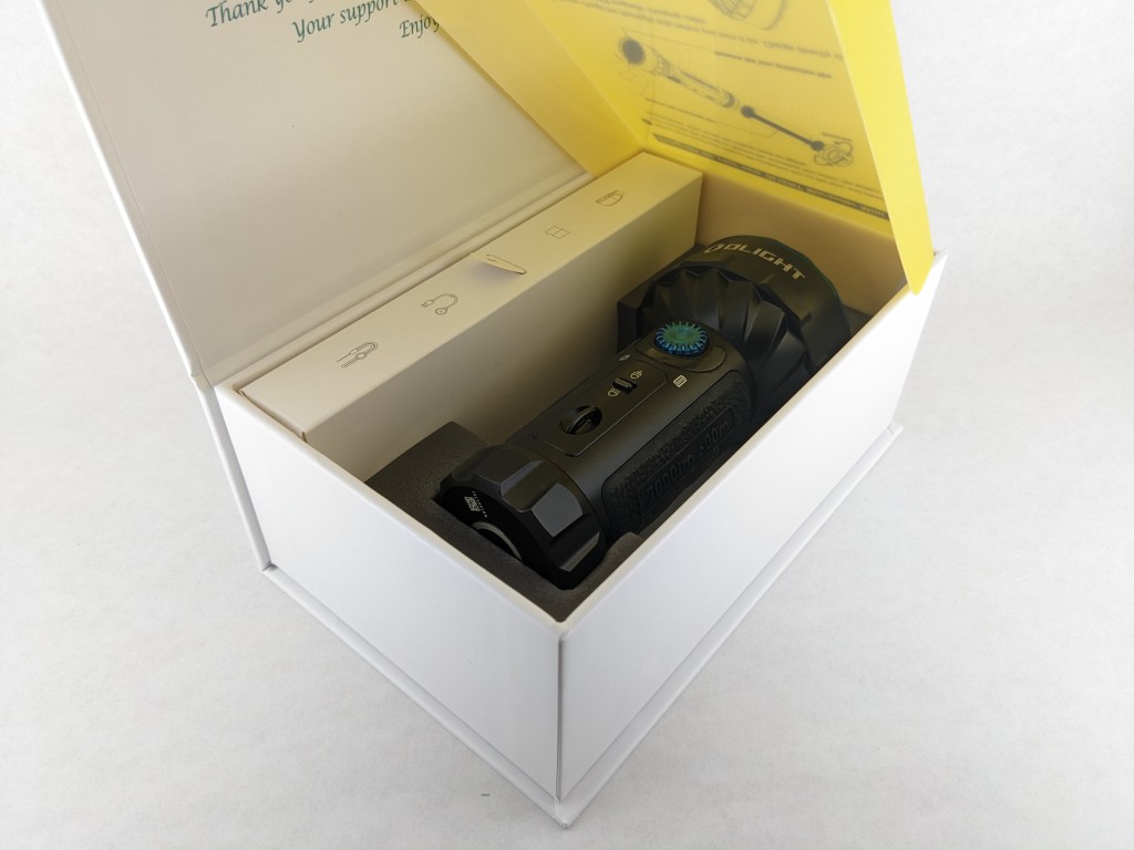Marauder Mini comes in Olight’s premium box design. It’s white laminated cardboard with high-quality printing and a magnetic closure. It’s a whole unboxing experience that’s sure to impress.