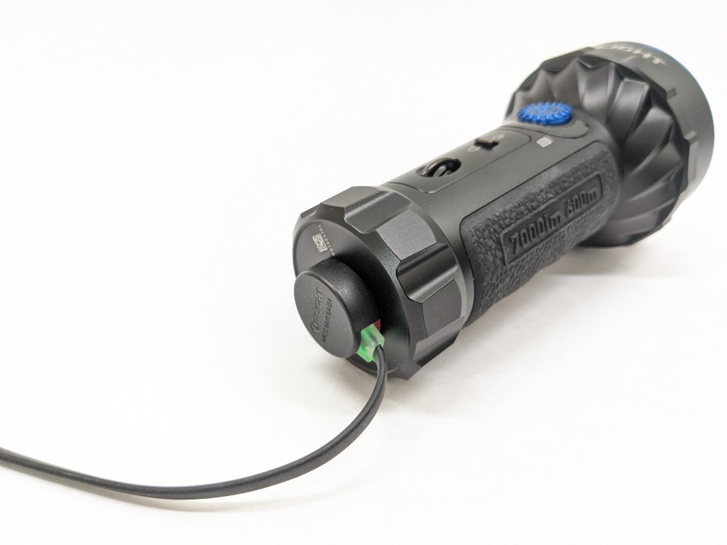 Charging is facilitated by Olight’s proprietary magnetic tailcap charging system. A USB-A charging cable is included that magnetically snaps onto the tailcap of the light. The puck has an LED indicator that glows red while charging and glows green when not charging. It’s easy to see but it’s a little too bright to have on your nightstand at night. The light is usable while charging. It’s worth noting that this is different than the full-size Marauder 2, which has a USB-C port.
