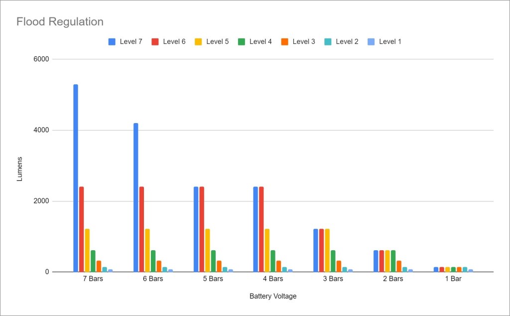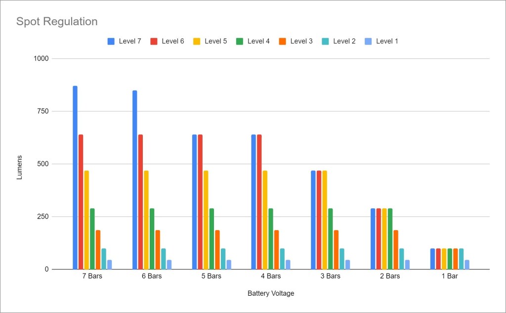 | Level | Lumens (Claim) | Lumens (Tested) | Candela (Tested) | Throw (Meters) | CRI (Ra) | Color Temp. (K) | DUV (Tint) |