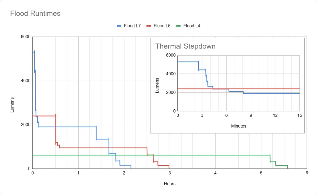 Performance is satisfactory. 3 minutes of turbo on Flood and 15 minutes on Spot are both excellent. Sustained Flood output is ~2500 lumens. Sustained spot is a little low at ~600 but that’s still plenty. Runtime is good too thanks to the large battery. The RGB channels don’t get hot enough to need a thermal stepdown and they all last for 5+ hours at respectable brightness.