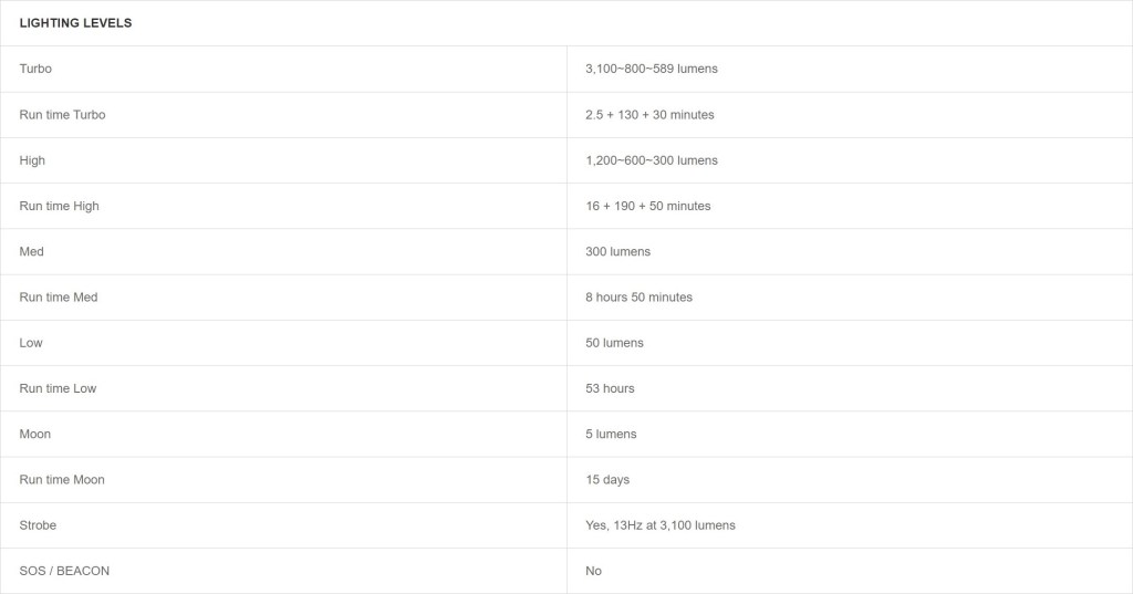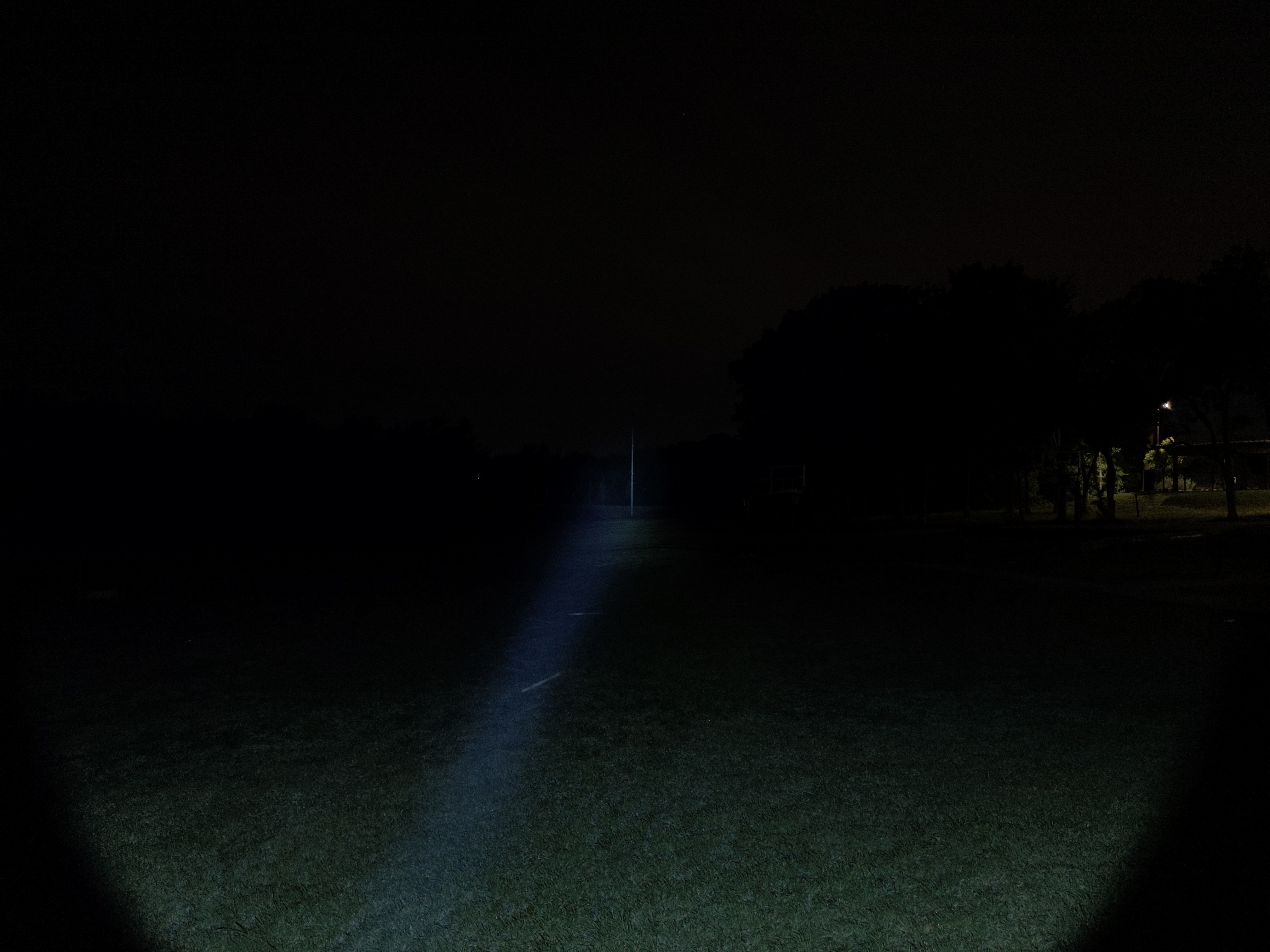 Disclaimer: All of my measurements are taken at turn-on. Lumen measurements were taken on a Texas Ace 3.5″ Lumen Tube. A candela measurement was taken at 10 meters with an Opple Light Master III on the highest brightness, and other candela figures were calculated relative to that. CRI, CCT, & DUV data were taken for each mode from a few feet away at the center of the hotspot with the Opple Light Master and Waveform DUV Calculator. Runtime tests were performed with the Ceilingbounce app on my smartphone. These tests were performed with a fully charged included battery unless otherwise specified. I cannot measure moonlight directly, so moonlight readings are calculated based on the brightness relative to the next-lowest mode. None of this is professional equipment, so take these measurements with a grain of salt.