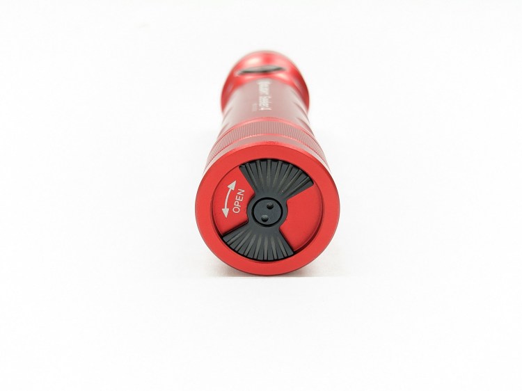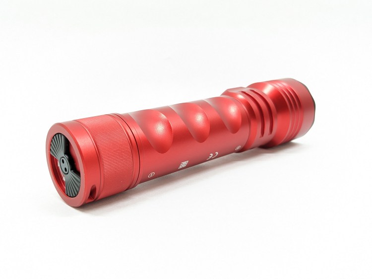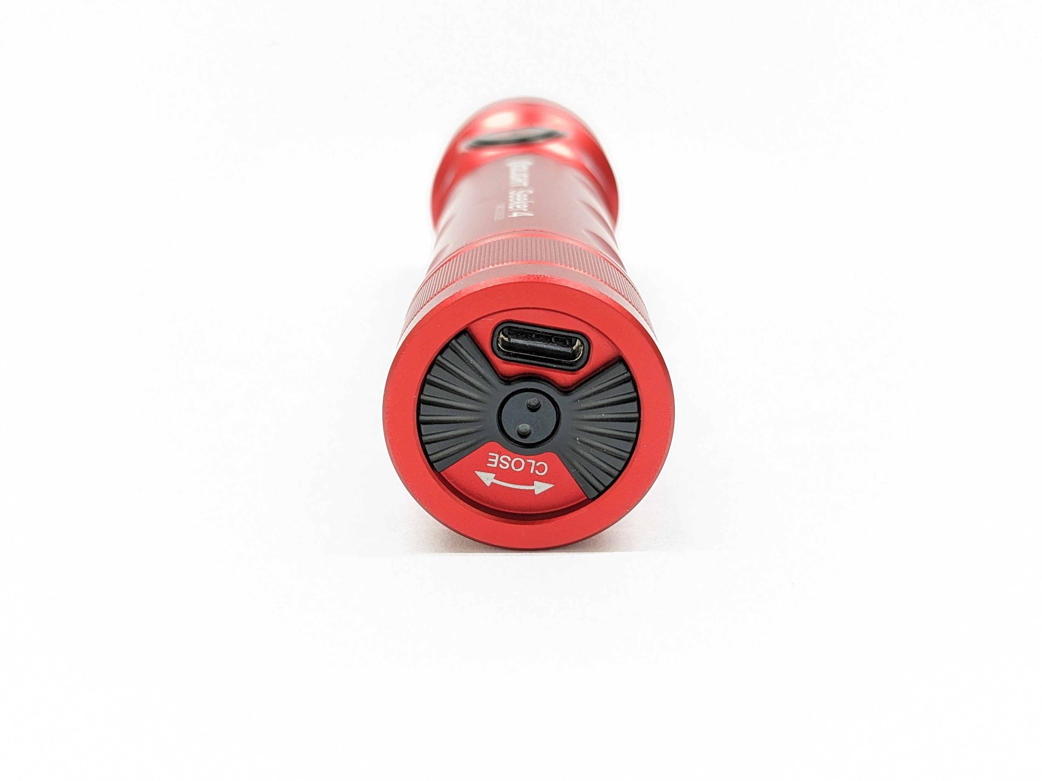I strongly prefer this simple switch over Seeker 4 Pro’s complicated rotary knob/switch, but I prefer Seeker 4 Pro’s array of indicator LEDs over this single one. This indicator LED glows red while charging and green when fully charged. When the light is activated, it will indicate battery status. Green means >60%, amber means 10-60%, red means 5-10%, and blinking red means <5%.