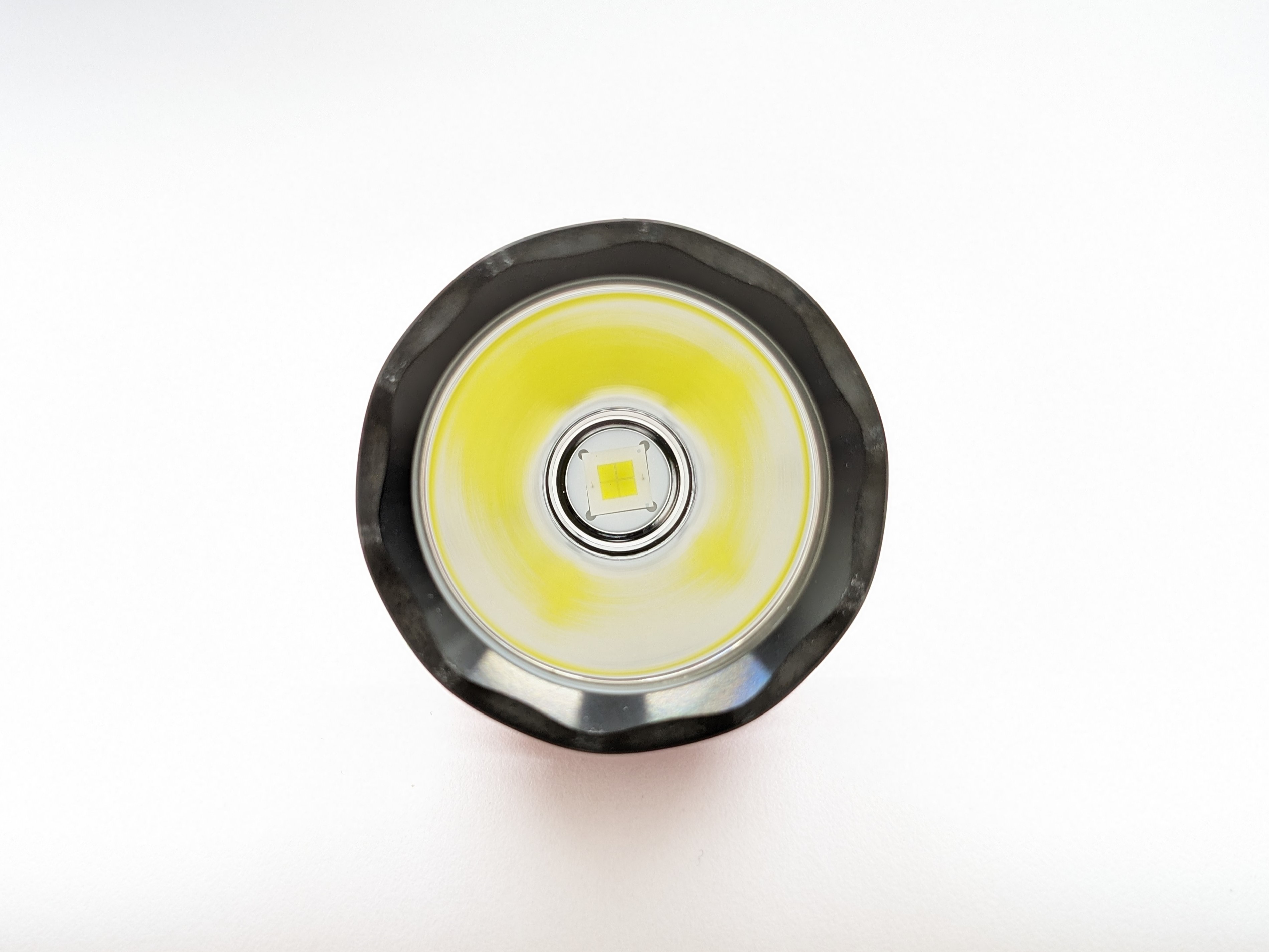 This light uses a Cree XHP50.3-HI LED in cool white with standard color rendering. It’s a good choice for brightness, throw, and efficiency. It doesn’t have the prettiest color properties though. It’s driven at ~12V. I was able to remove the bezel, but I had to use some super grippy rubber gloves. I would have liked a warm-ish, nice-tinted, High-CRI LED option too, like a sliced XHP50.3-HD. I like this single-emitter setup better than the quad-emitter design of Seeker 4 Pro.