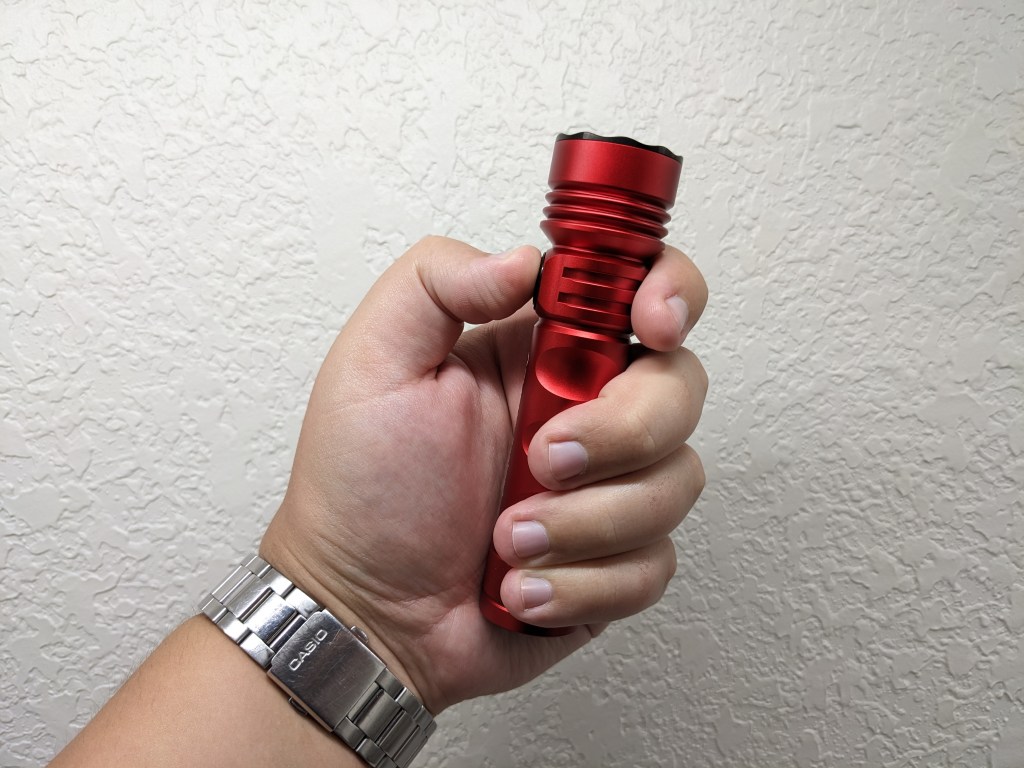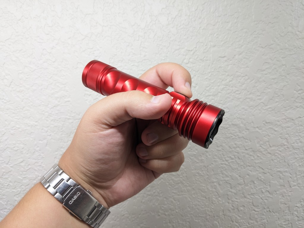 Seeker 4 is similar in design to all the other Seeker lights since Seeker 2. It’s a cylinder with some finger grooves and a mildly flared head. I think it looks great in this red anodizing with black accents.