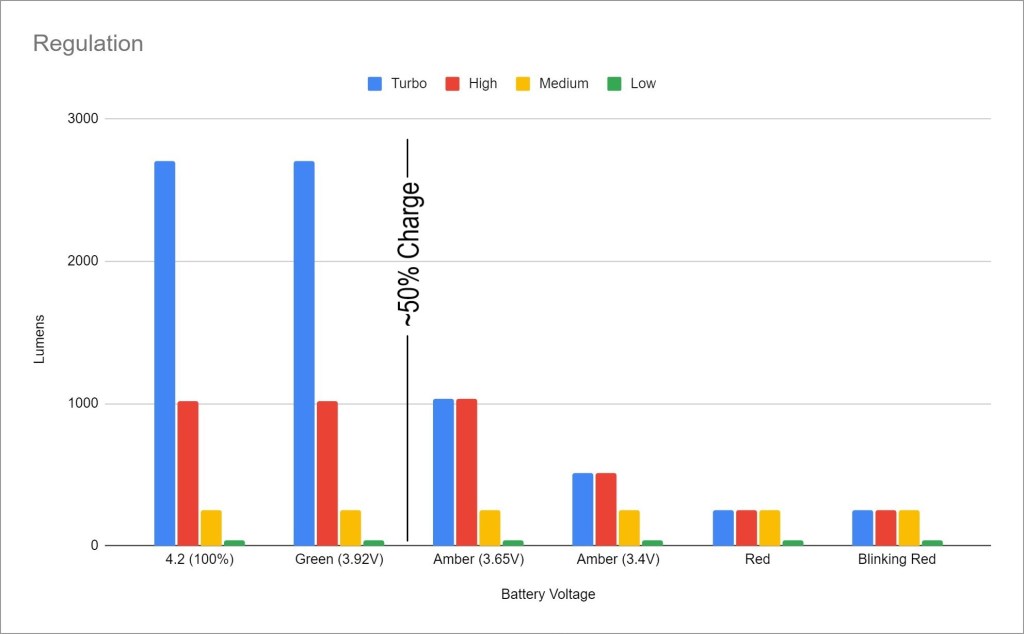 Thermal regulation: Timed step-downs only. No active thermal regulation. That means the light will perform consistently but may also overheat in hot weather or leave some performance on the table in cold weather.