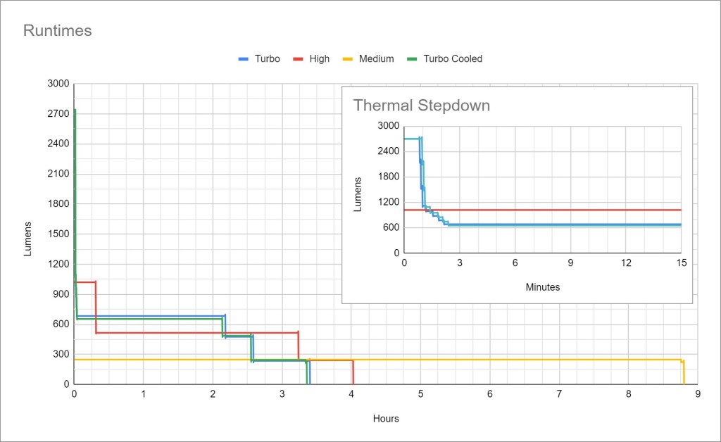 Performance is fine, but unimpressive. Turbo lasts for 1 minute before a timed stepdown. Maximum stable output is ~675lm (below average for a light this size). High mode has a strange stepdown from ~1000lm to ~500lm about 15 minutes in. Total runtime aligns with other lights I tested in this size/battery class.