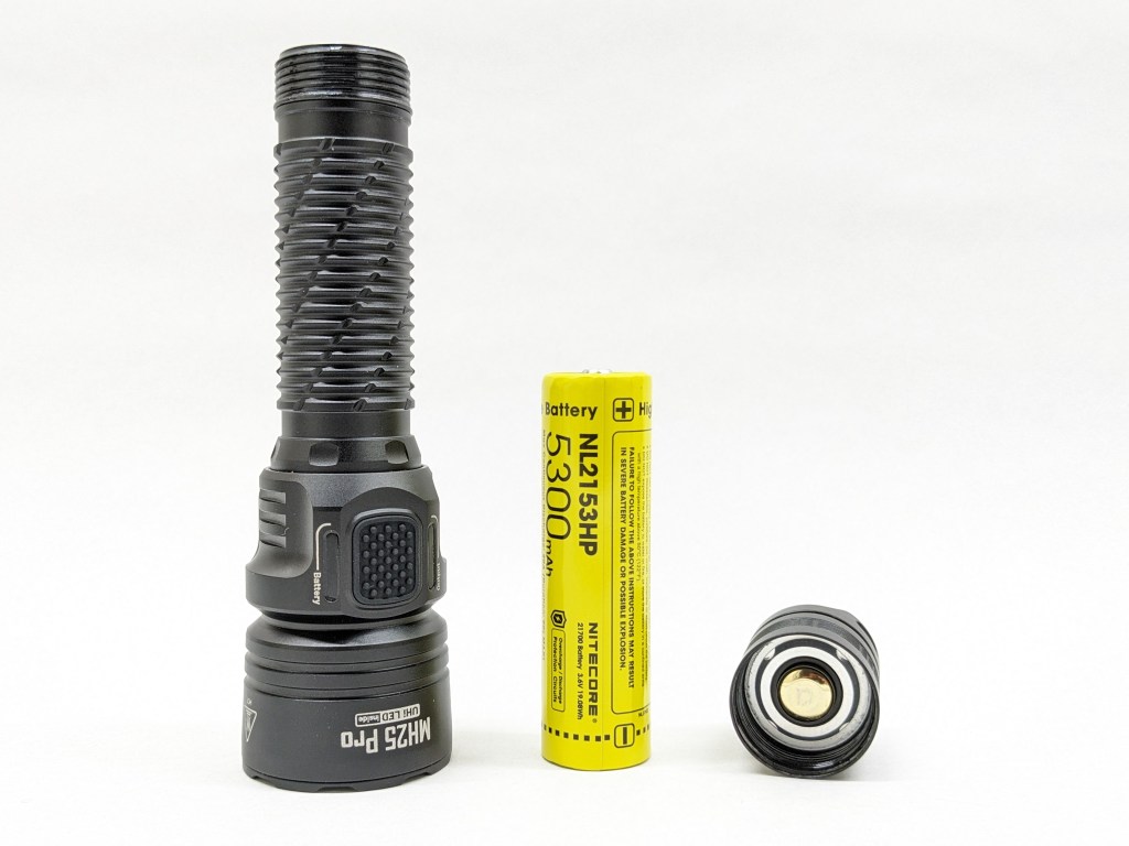 The battery included is a 5300mAh, protected, button top, 21700 cell. I’m delighted that this light uses standard batteries, not Nitecore’s proprietary “i” series batteries. The positive terminal inside the light is spring-loaded, but there’s a physical reverse polarity protection ring around it so you must use a button-top battery (or a flat top and one of these spacers from Convoy).