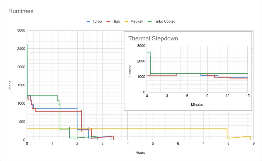 Thermal regulation is present, to an extent. Turbo stepdown is timed, regardless of temperature. My Turbo Cooled test shows significantly higher sustained output, but it’s capped at 1200lm.