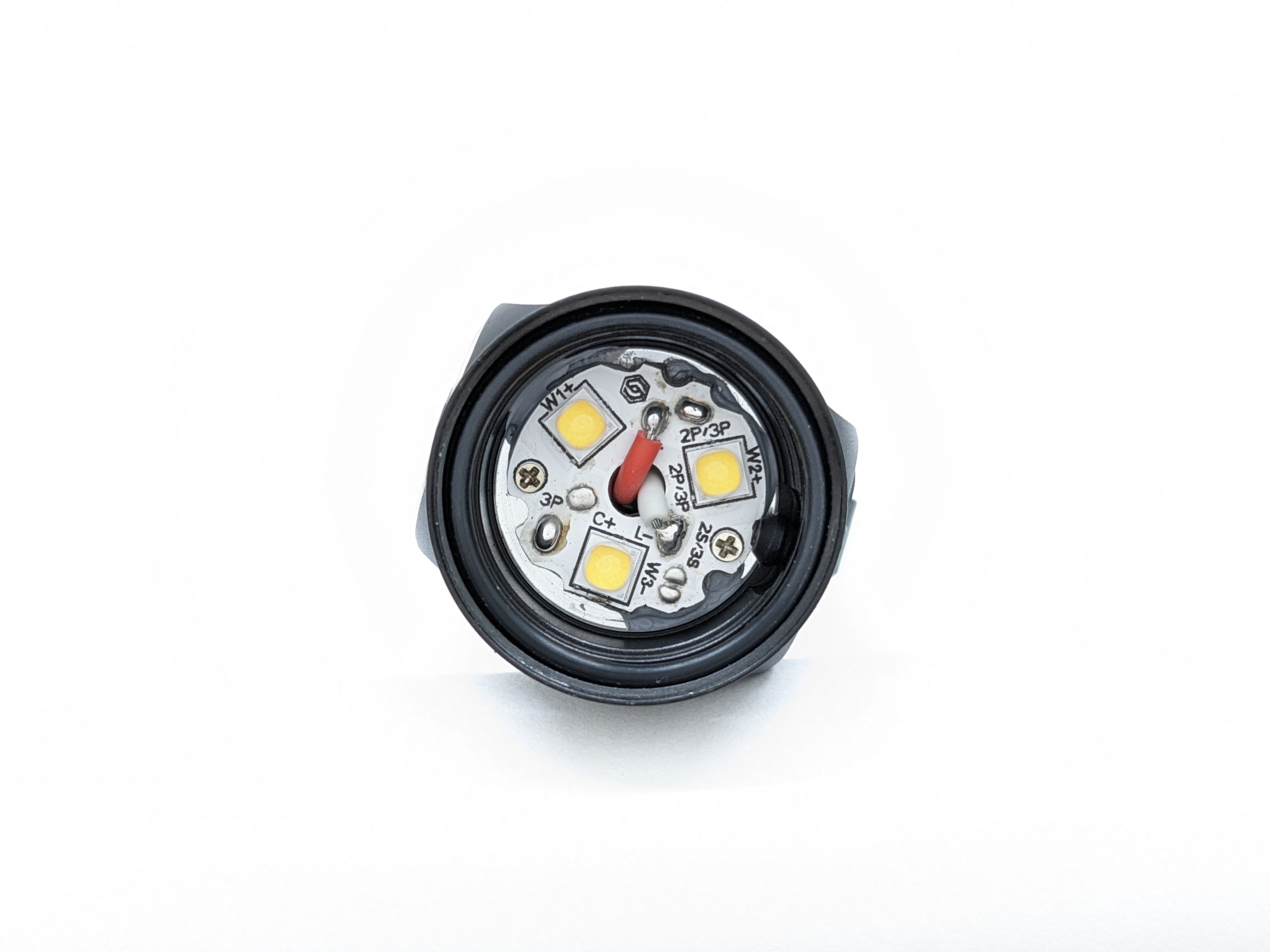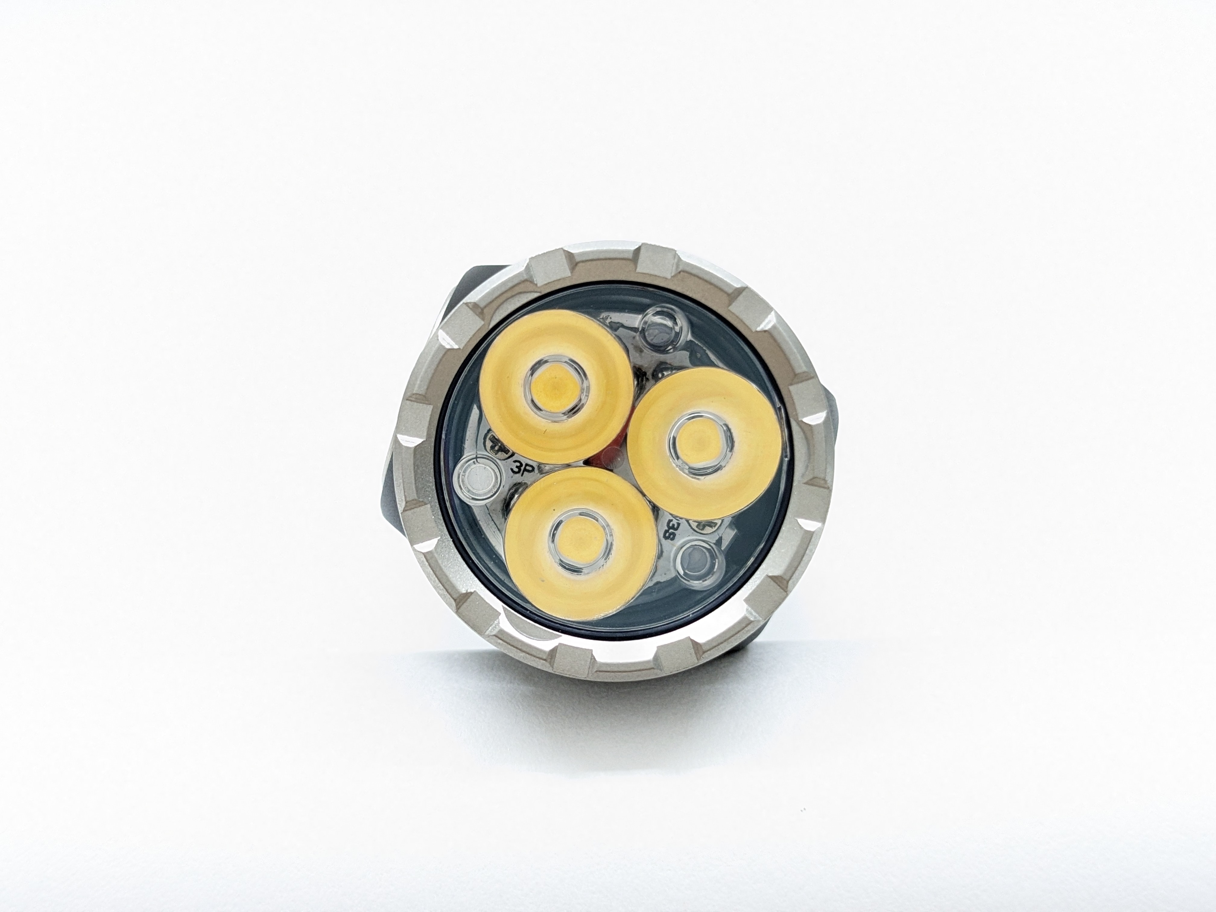 EC200 uses three LEDs under a TIR optic. It’s not a Carclo optic, but Skilhunt told me Carclo’s 105##-series optics will fit in this light if you want to change the beam profile. Neat! Two LED choices are available at the time of writing: “cool white”, or Nichia 519A 4500K. Mine has the Nichia LEDs.