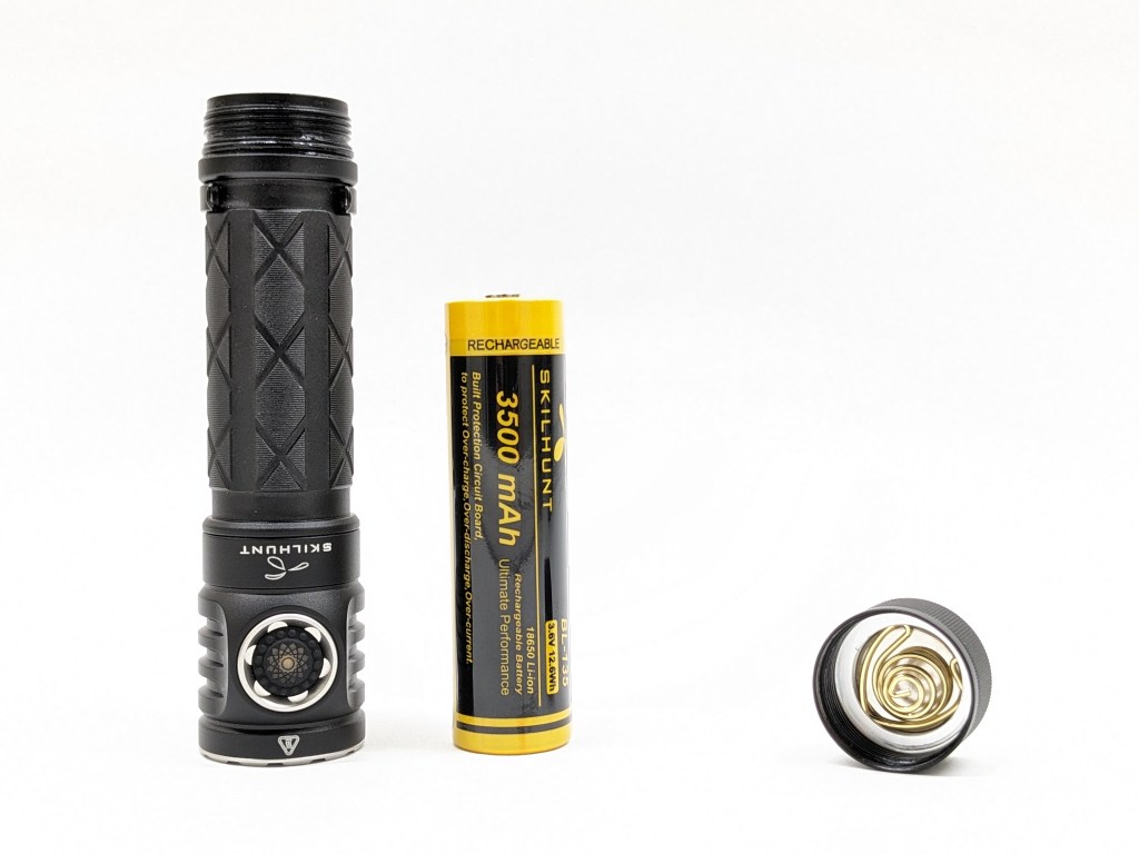 The magnet inside the tailcap is strong enough to hold the light up on a vertical surface. If you don’t like the magnet, Skilhunt includes a plastic spacer in the box to replace the magnet. Use some needlenose pliers to remove the tailcap spring and make the swap.