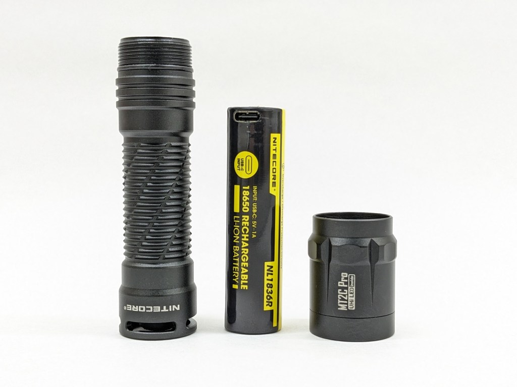 M2TC Pro used a NiteLab UHi-20 LED. I’m not certain it’s exclusive to Nitecore, but no one else is branding it “NiteLab”. It’s an intense round-die domeless 3V emitter that’s GREAT for throw. The color properties are sub-par, but I don’t think high CRI and good tint are important in throwers. I tried to unscrew the bezel but it wouldn’t budge.