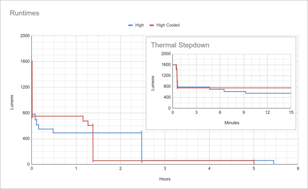 Thermal regulation consists of a timed stepdown at 30 seconds to a cap of ~800lm. From there it has active thermal regulation and will adjust brightness based on temperature, but it won’t exceed ~800lm unless you turn it off and back on.