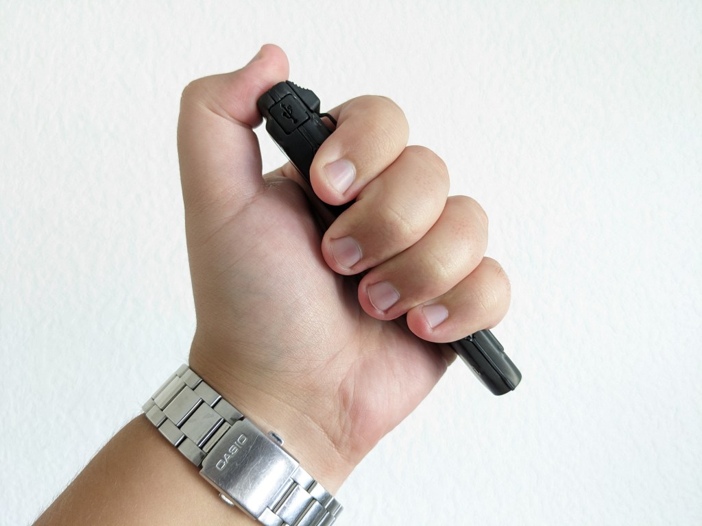 Ergonomics are fine. In a reverse grip, it can be hard to access both switches if you hold it flat, so I end up holding it like the photo below. A cigar grip also works well.