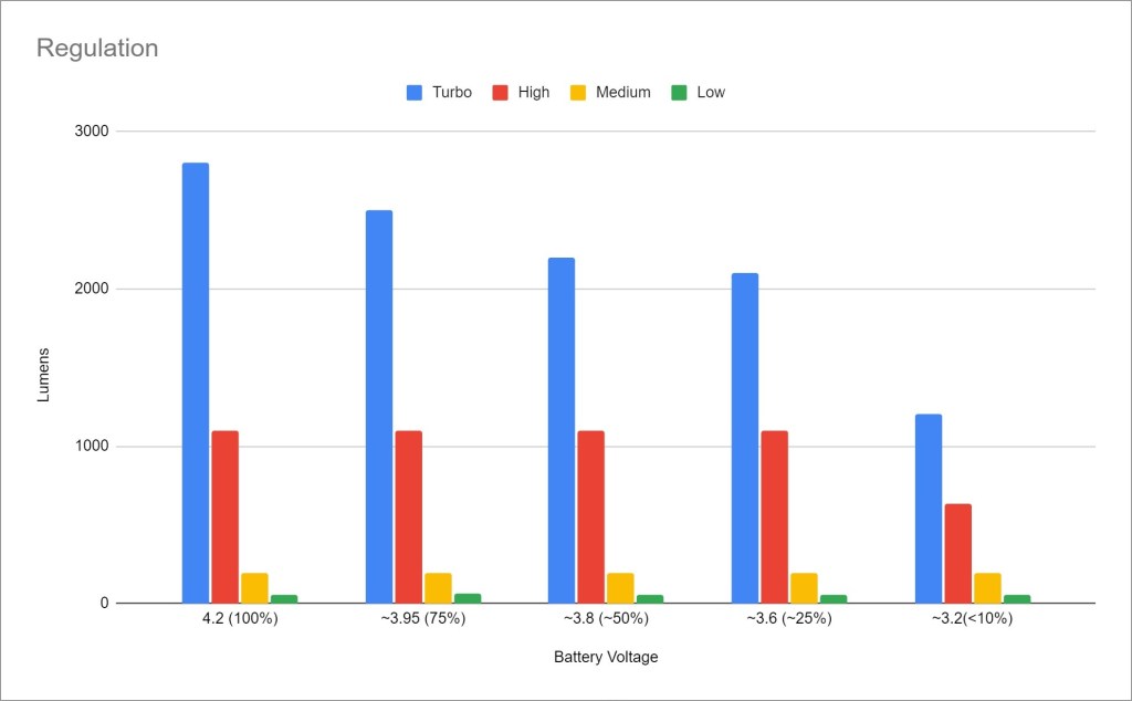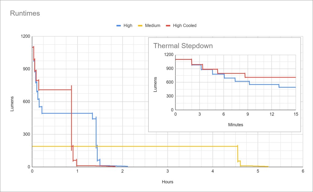 Thermal regulation consists of a timed stepdown from Turbo at 7-8 seconds, and from High mode at the 2-minute mark. Then it displays active thermal regulation that maximizes brightness for ambient conditions.