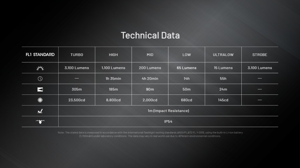 Disclaimer: All of my measurements are taken at turn-on. Lumen measurements were taken on a Texas Ace 3.5″ Lumen Tube. A candela measurement was taken at 10 meters with an Opple Light Master III on the highest brightness, and other candela figures were calculated relative to that. CRI, CCT, & DUV data were taken for each mode from a few feet away at the center of the hotspot with the Opple Light Master and Waveform DUV Calculator. Runtime tests were performed with the Ceilingbounce app on my smartphone. These tests were performed with a fully charged included battery unless otherwise specified. I cannot measure moonlight directly, so moonlight readings are calculated based on the brightness relative to the next-lowest mode. None of this is professional equipment, so take these measurements with a grain of salt.