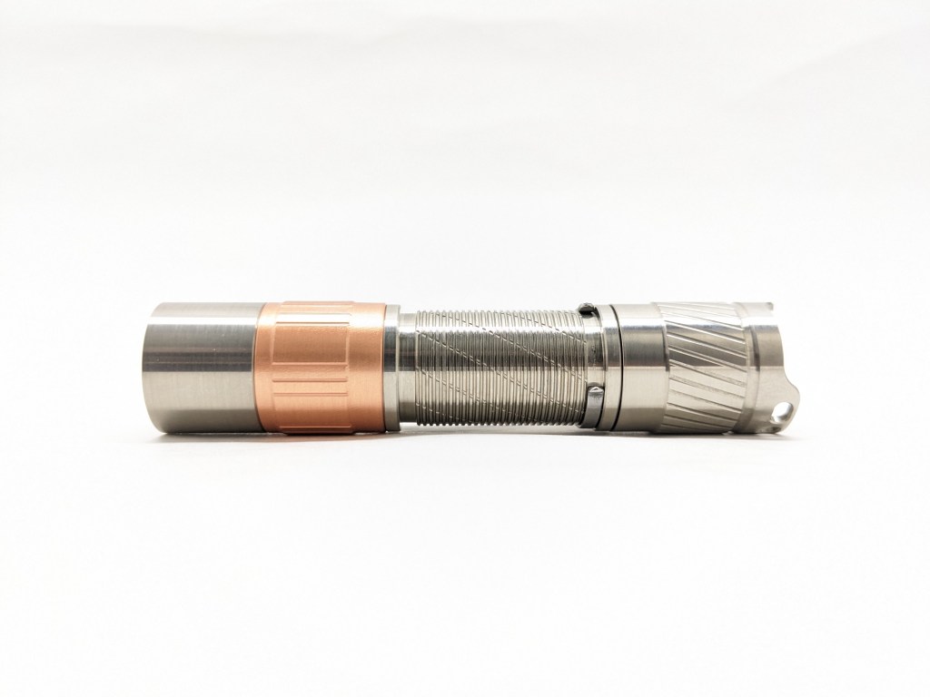 This is an attractive light. I chose the “glossy” titanium version with a copper head and it looks phenomenal. The whole light has a machined finish, but the copper has a clear coat over it that turns it glossy and prevents oxidation. If you want it to patina, you must remove that clear coat. The body tube is slimmer than the aluminum version.
