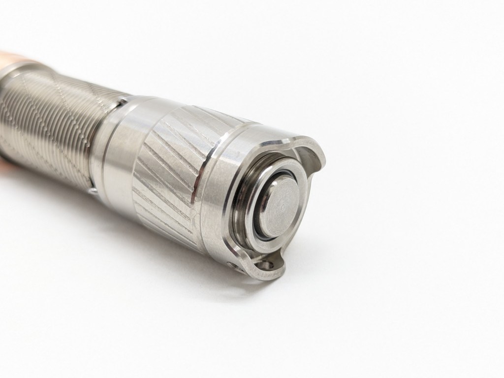 The switch is a reverse clicky mechanical on the tailcap. It’s covered by Convoy’s steel switch boot, which matches the titanium well. The boot sits a little bit crooked and it takes virtually no force to tap it and change modes. I would have preferred a forward clicky and a rubber boot, personally. This steel boot looks a lot classier though.