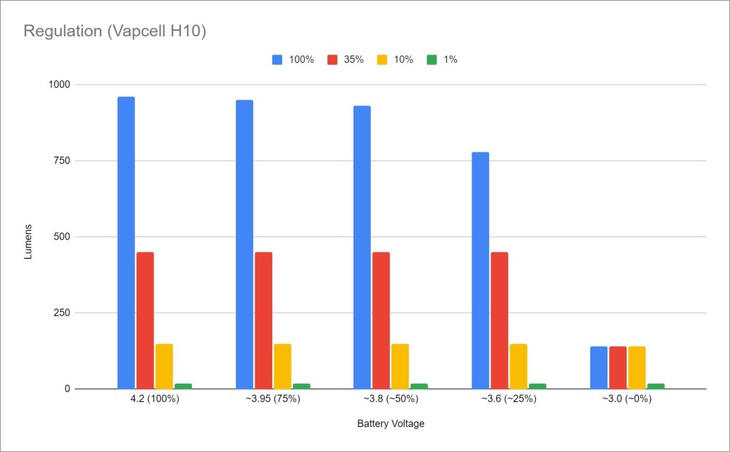 Thermal regulation consists of a timed stepdown from 100% by the 2-minute mark. Past that, active regulation is technically present but doesn’t do much. My 100% Cooled test only differed with a ~40lm increase in sustained brightness with ~10min shorter runtime.